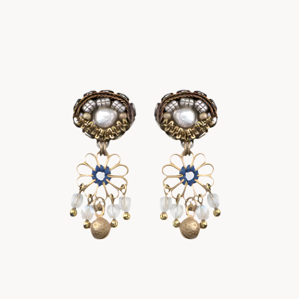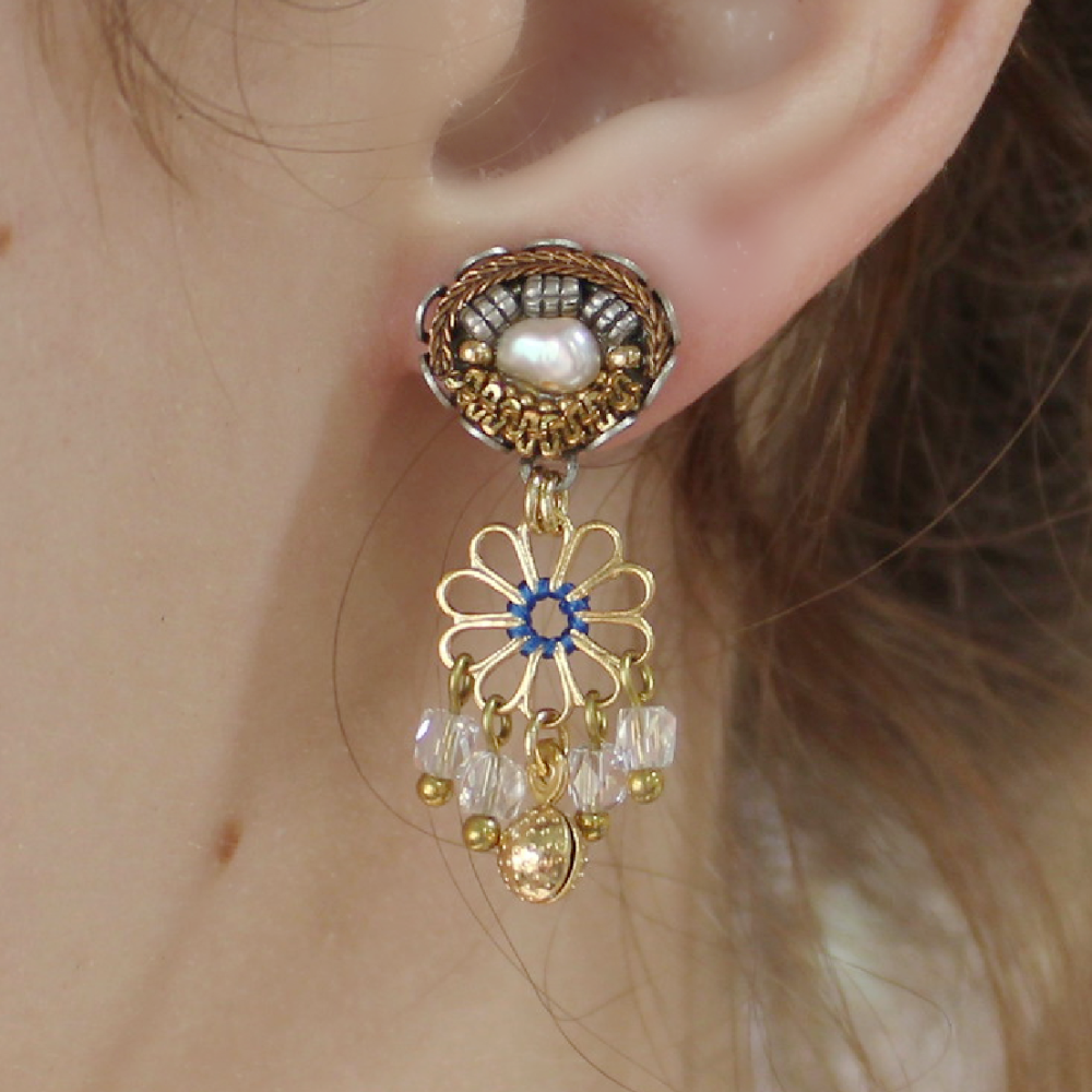 Lovelies, these Golden Totem Maria Earrings are sure to catch your eye because they truly are the sweetest darlings! The posts feature a rounded upside down teardrop that links to a cutout wildflower design. The flower has an assortment of baubles that dangle below. The gold and silver metallic pair beautifully with the pearl accents. There is also a touch of indigo in the center of the metallic floral design. The whole design is like a breath of fresh air. With this unique design that is both dainty and daring and could also be styled for a more edgy or elegant look, you are sure to stun in all looks.