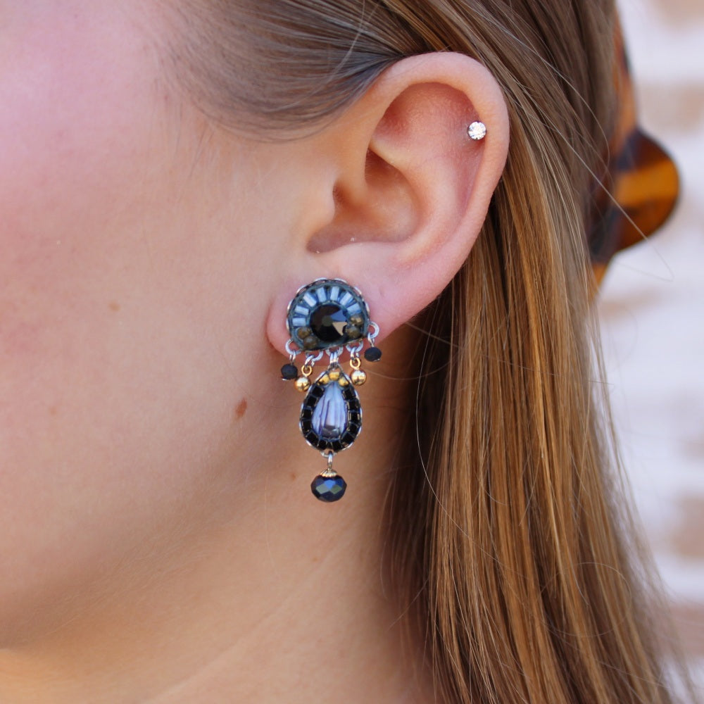 These Indigo Summits Imelda Earrings are darling and are sure to catch the attention of those around. Featuring a combination of European crystal, Czech glass beads, textiles, and hypoallergenic metal, this design is beautifully textured and is sure to catch the light in a lovely way! This design features a semicircle post that is flat at the bottom and has an assortment of baubles that dangle below it. Connected to the post is a tear drop with its own singular bauble that is significantly bigger than the ones above. The varying indigo hues create a slight gradient with the help of light being caught in a stunning way!