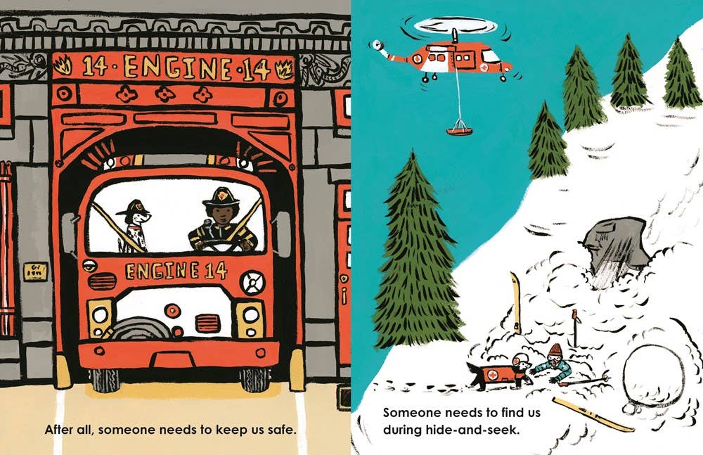Have you ever wondered what dogs do all day when their people leave for school or jobs? What if they went to work, too . . . ? This clever picture book describes all the real jobs that dogs do. From a therapy dog to a mayor dog and even a lobster-diving dog, the possibilities will surprise you! But, of course, there is one job that dogs love more than any other: being a best friend. In the back of the book, the author provides more information on the various real jobs we see dogs doing in the story.
