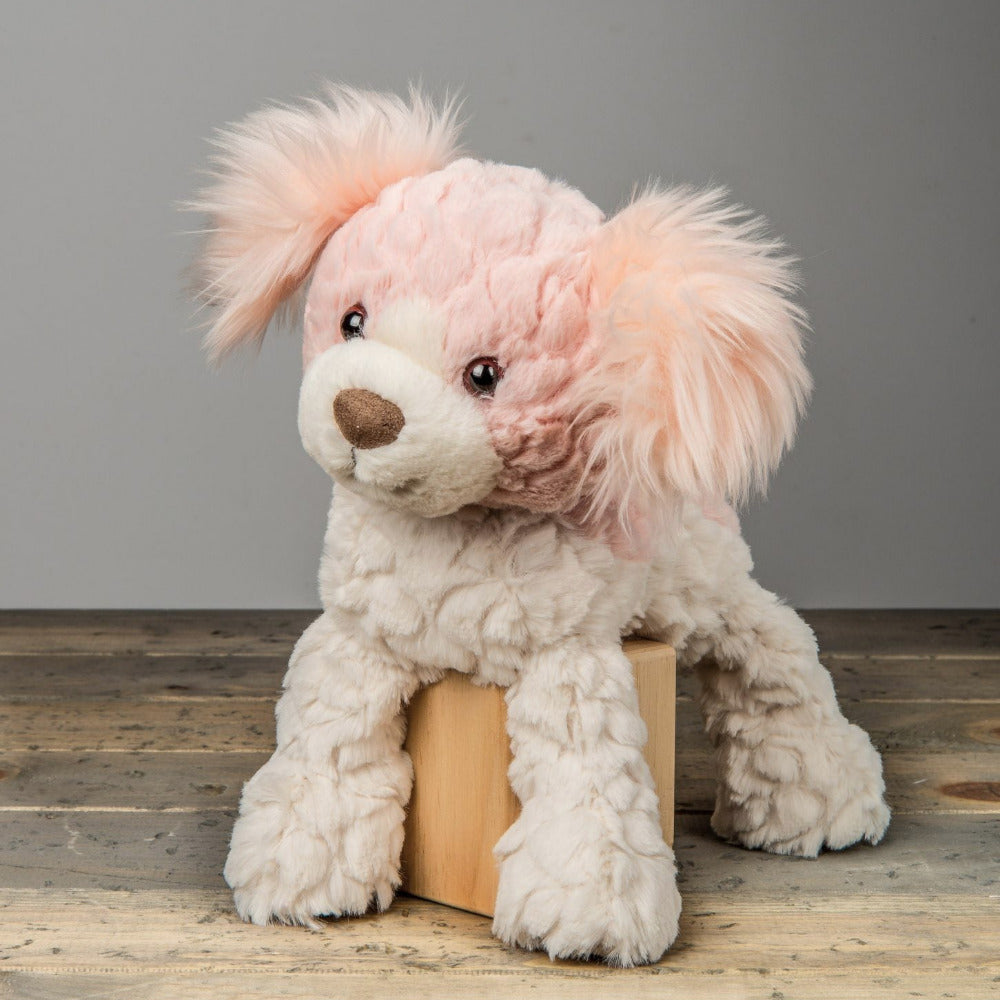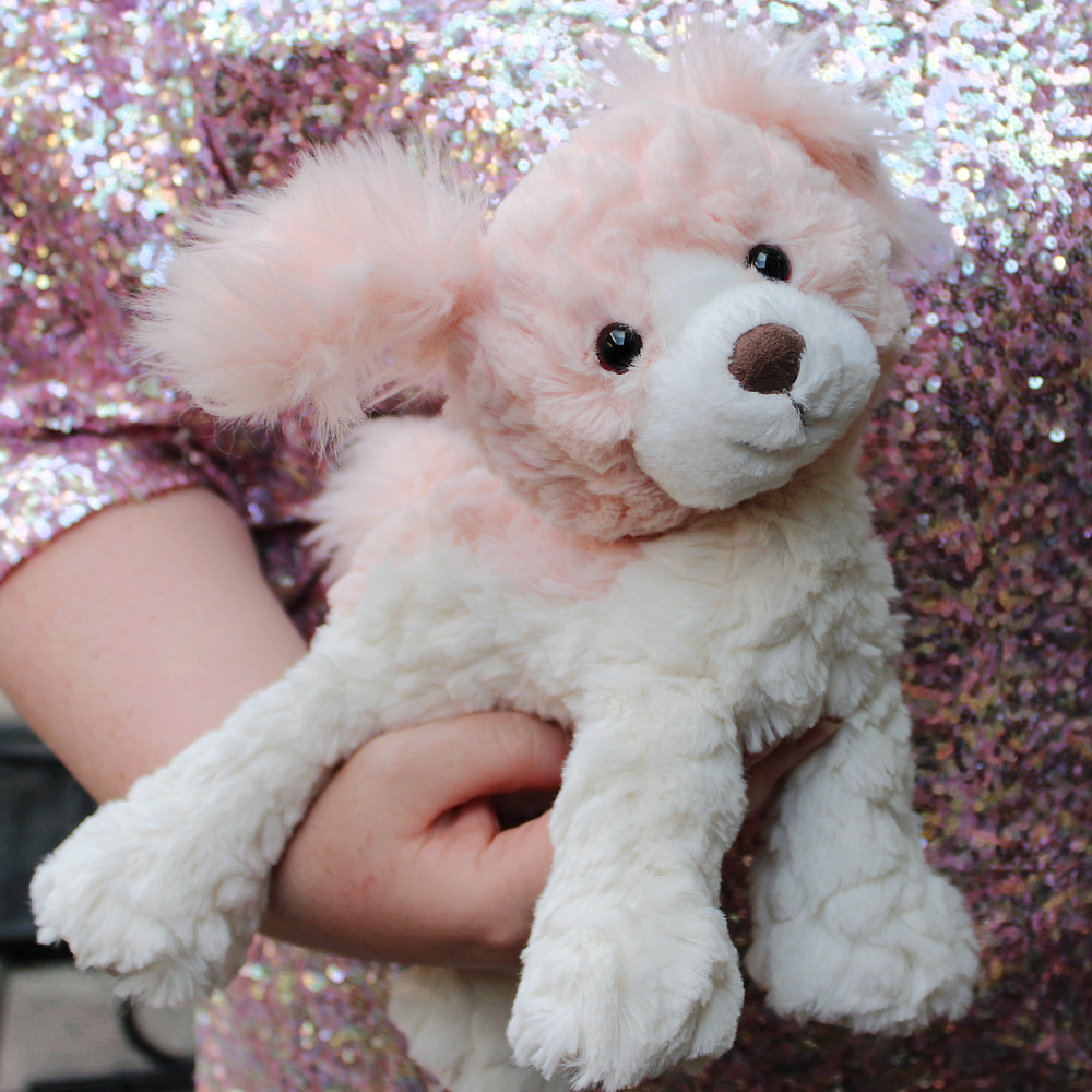 This floofy friend is sure to bring a touch of class and whimsy to your day. Showcasing the colors blush and cream, this stylish Paris Putty Puppy is ready for whatever errand running adventures the day has ahead. For those who need a companion during those long days when the adults are doing whatever it is that is oh so important. This cutie is sure to keep your kiddo in the best of company. This pupper is perfect for snuggling as the legs are floppy and ready for snugs. The body is a cream color, and the head is colored blush and has puffy, furry ears. CUTE!