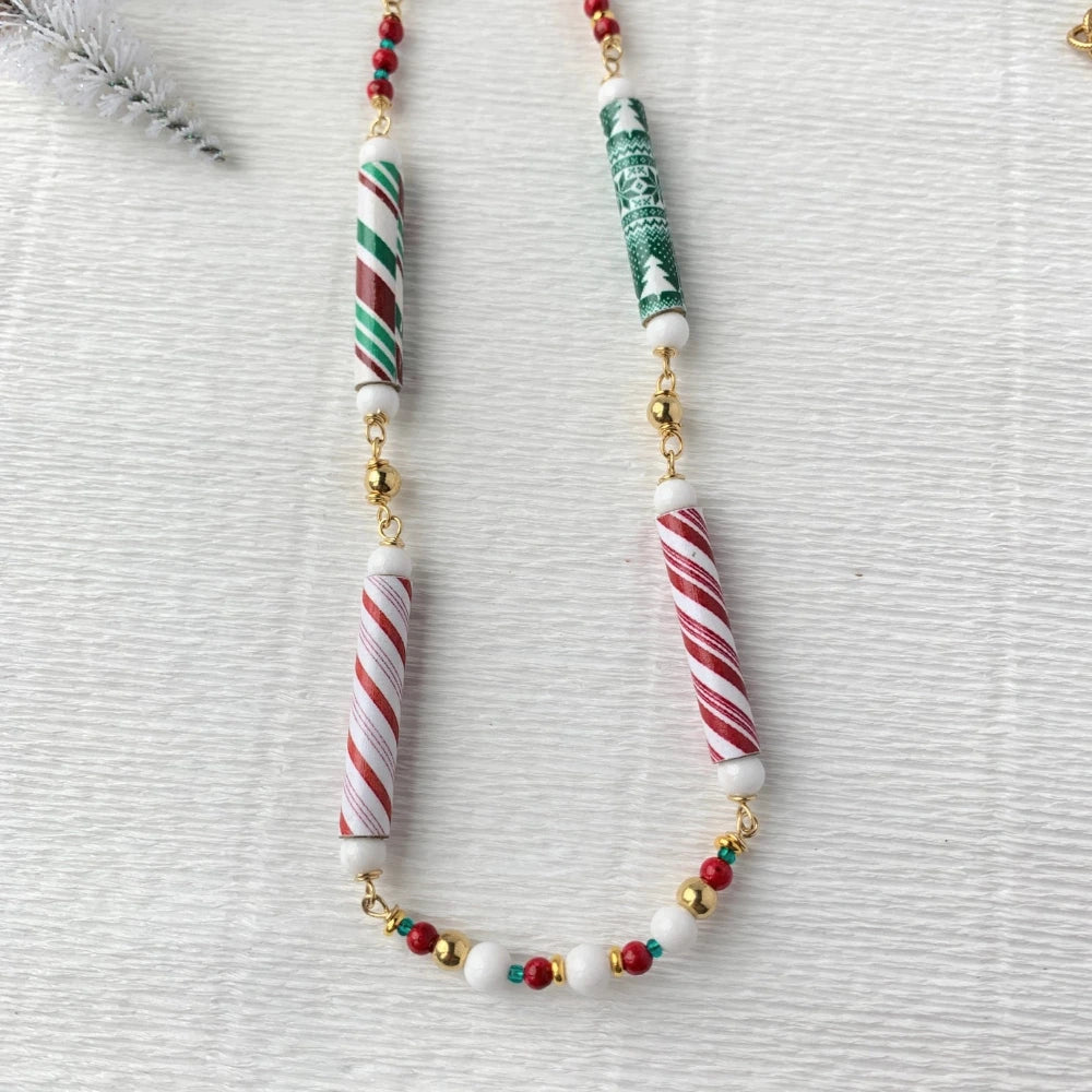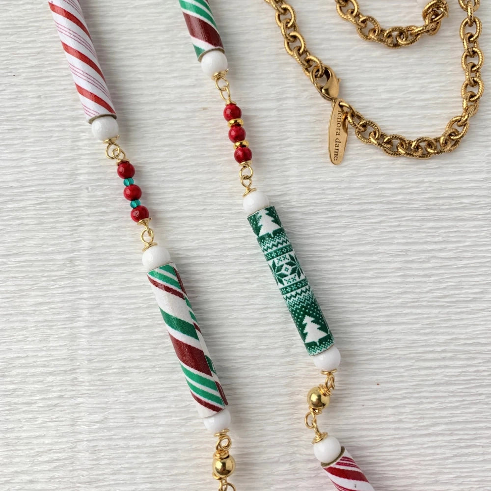 - Tube beads wrapped and decoupaged in festive holiday prints that resemble wrapping paper - some appearing to be peppermint sticks!