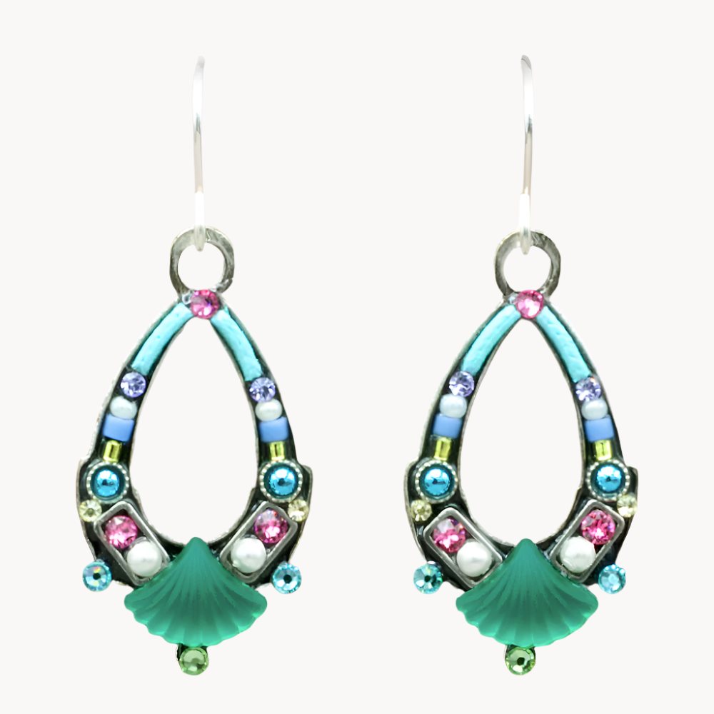 These Firefly teardrop hoops earrings look as though they just popped out of an ocean fairytale. We are obsessed with this color scheme. The wire hooks are connected to a teardrop design with the middle portion cut out. Along the design are various European crystals and other materials that add a splash of color, sparkle and shine to this piece. At the bottom of the earrings are a green scalloped shell that almost glows in the lighting. You are sure to feel as enchanting as these Beach Glass Sophie Hoop Earrings when wearing these colorful and chic earrings that are sure to be a delight to style.