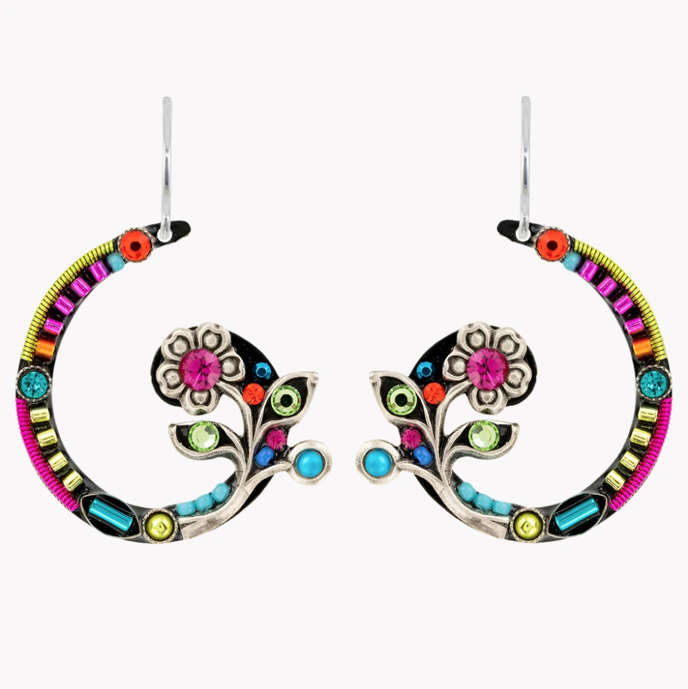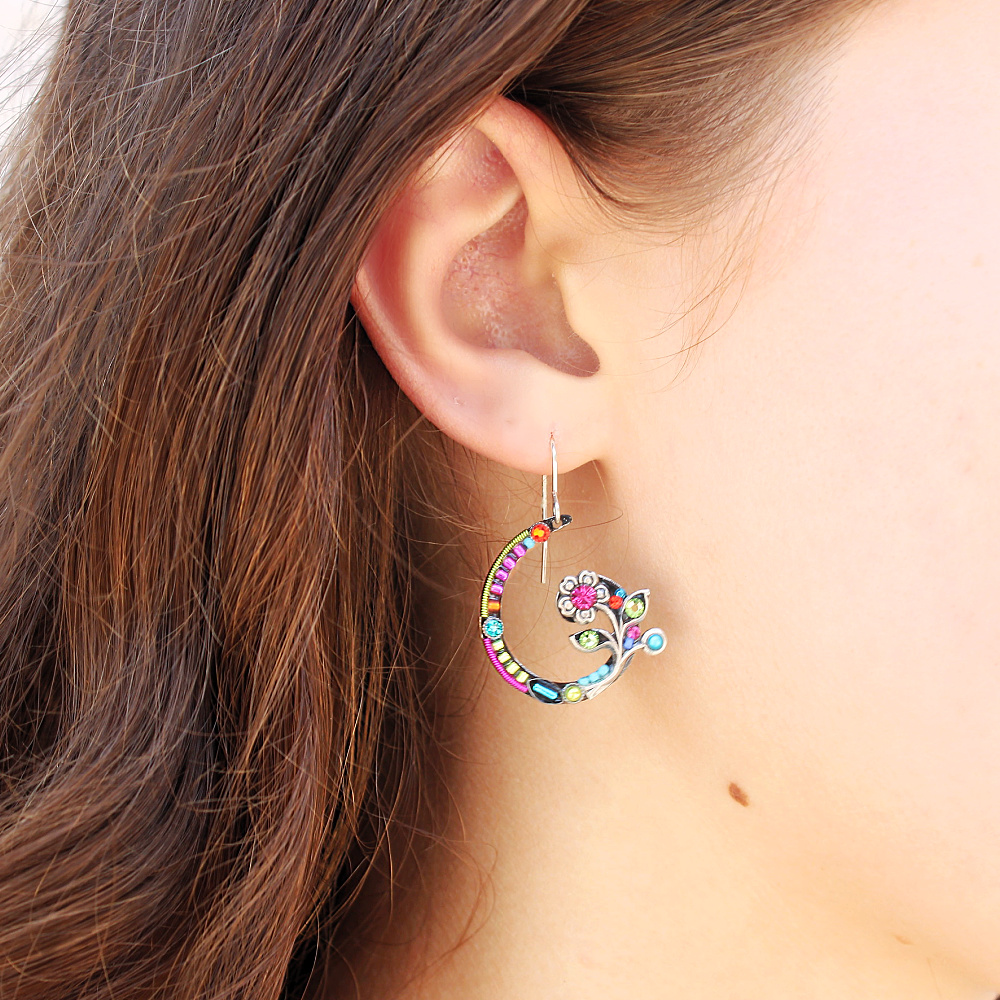 If you are looking for statement earrings, then these are sure to catch your eye. How can they not? These spiral earrings are a colorful combination of sparkle and uniqueness! The Floral Spiral Earrings feature a subtle curl in the design that leads to a flower at the center of the spiral. Made from materials like European crystals and fire-polished Czech glass beads, these earrings are sure to bring a not so subtle pop of colors to your ensemble in a fun way. The versatility of the color scheme is sure to be a dream to style. The details are simply mesmerizing!