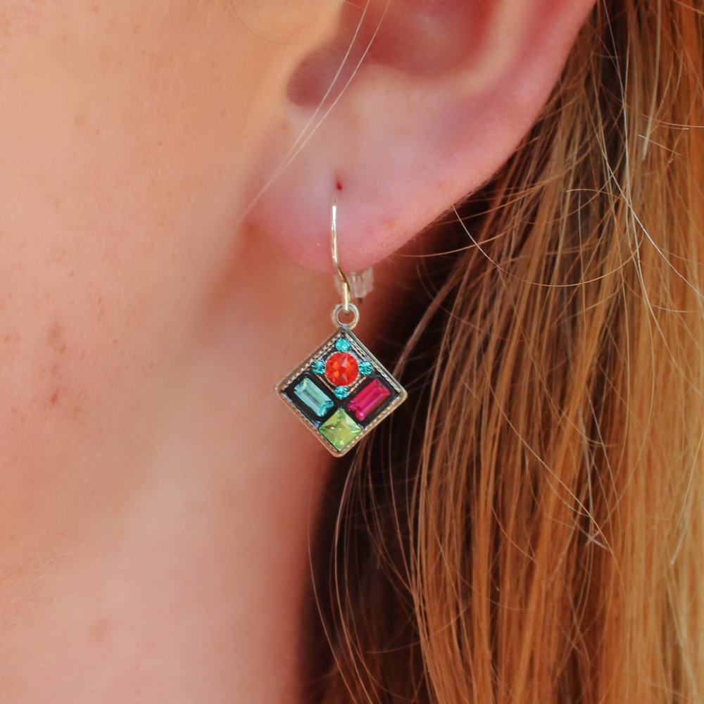 These dainty Architectural Arya Earrings are packed full of character! Their architectural style allows them to colorblock in a unique way. The entire design is a square that is tilted and resembles a flat diamond shape. Inside the diamond shape are European crystals and Czech glass that are positioned to fill the space in an effortless way. The blue, purple, orange and green pair so beautifully as they come together to create a cohesive piece of wearable art. Clean in design and wonderfully fun in creativity, you are sure to find your daily ensembles feeling more lively with these by your side.