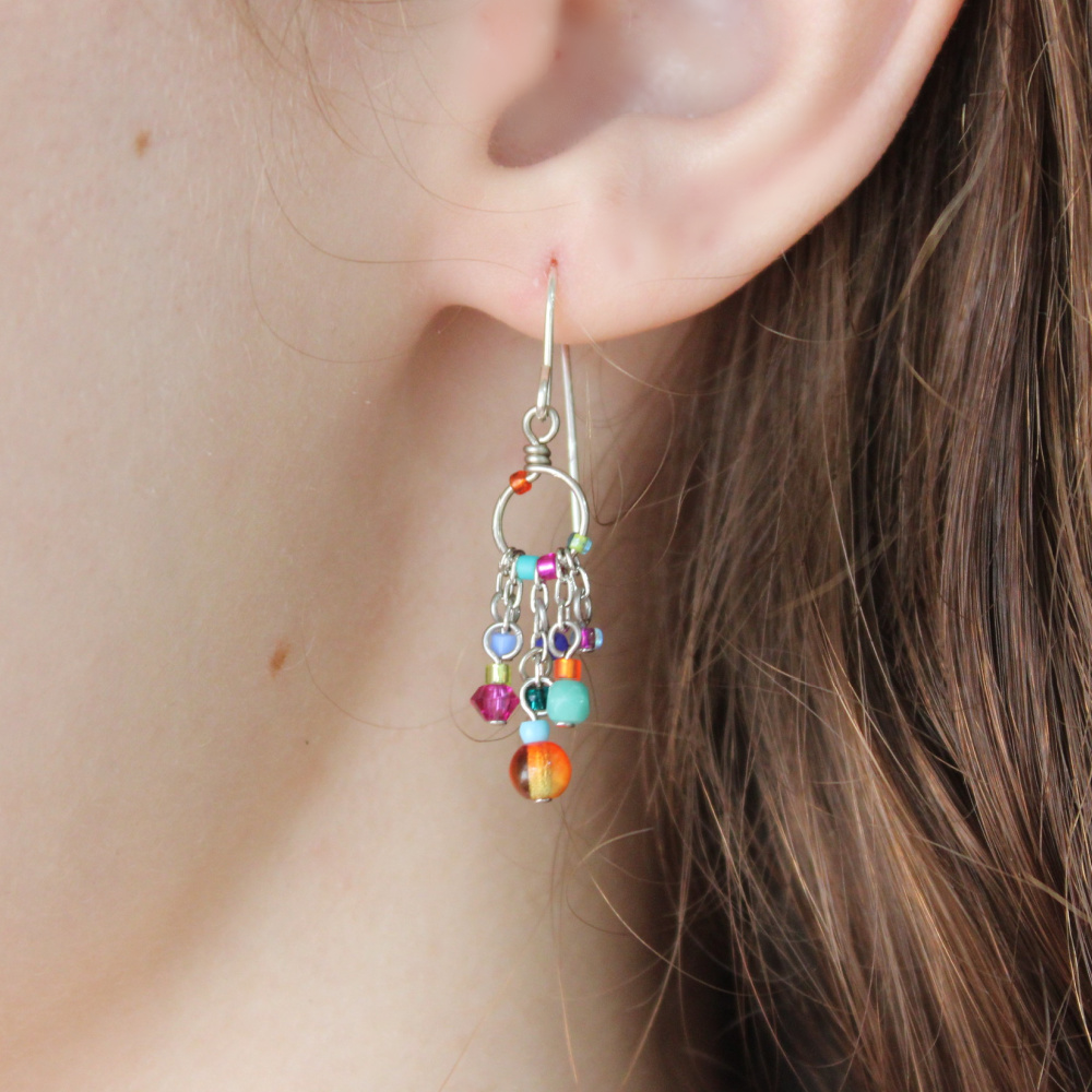 These Delicate Angeles Earrings are full of fun styling possibilities. The delicate design also has an element of edginess that is paired with whimsical color. The wire portion from the hooks to the circular design has cute beads at the bottom of the circle, and is linked to multiple small chains of varying length. The chains feature gorgeous multicolor European crystals, Japanese and Czech glass beads that bauble below. The baubles are hues of orange, purples and blues. This design is reminiscent of a dreamcatcher which to us, makes them all the more a fun pair to wear with short hair or an updo.