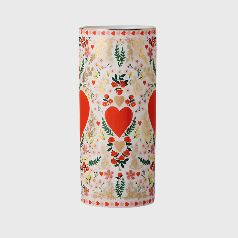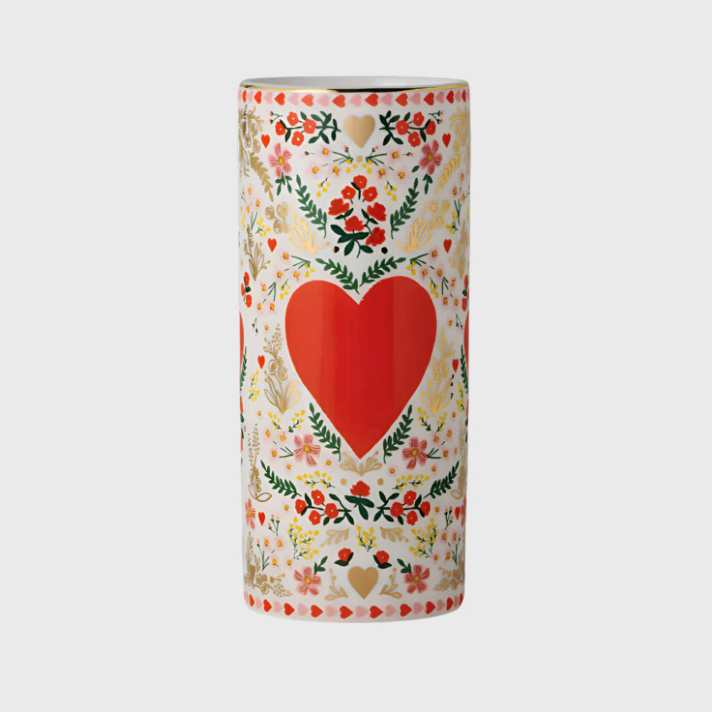Stop! We are obsessed with this Juliet Porcelain Vase! This cylindrical vase is a sight for sore eyes. This design features an assortment of foliage and heart designs. The colors are dominantly white, pink and red with yellow and gold accents. This romantic design is sure to look lovely in a bedroom, kitchen or living space. It would make a great gift for a loved one, just don’t forget the flowers. Those are not included! This colorful vase is joy personified. Its cheerful appearance is sure to bring a smile to the face of those who are destined to receive those flowers.