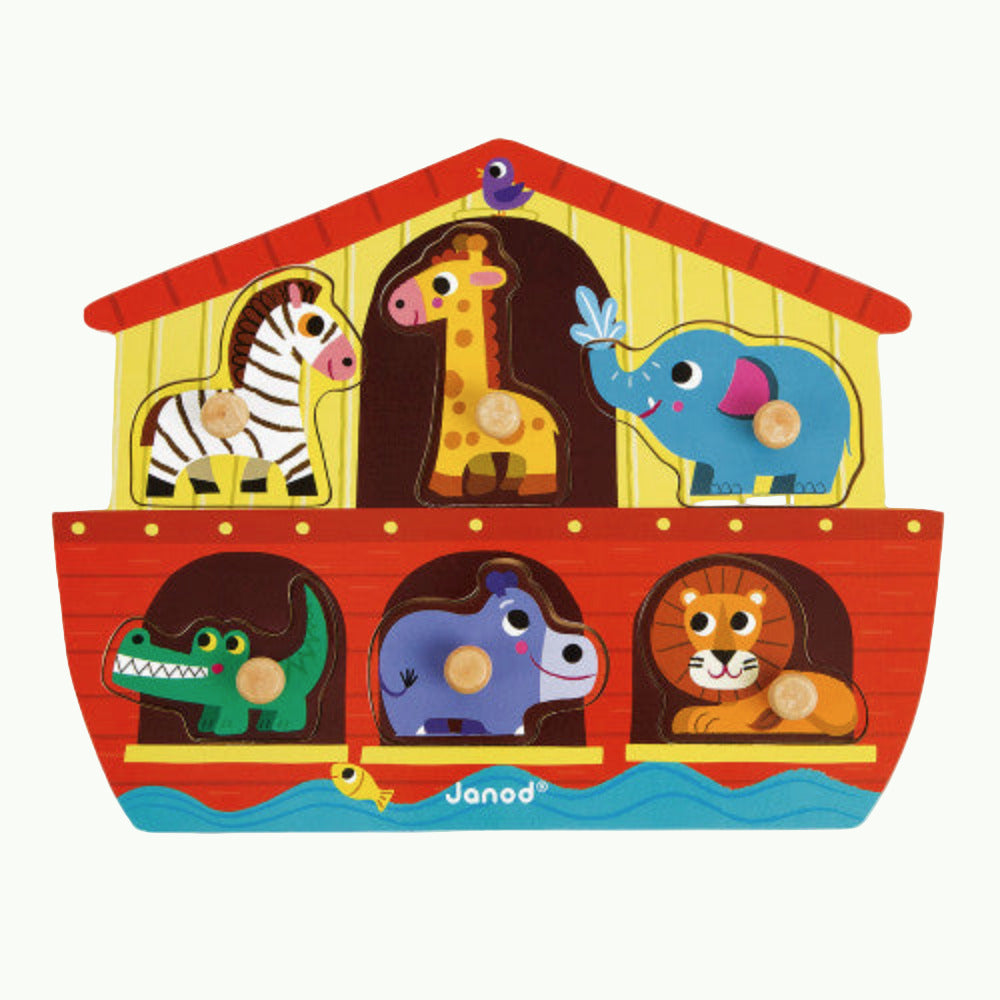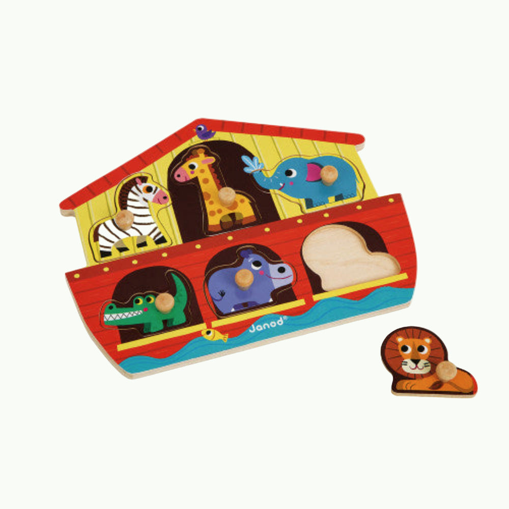 This puzzle is perfect for helping your little one learn their animals and listen to a classic story of Noah's Ark that is sure to help engage them in educational play. This Noah’s Ark peg puzzle is sure to catch the eye of the young ones with the bright colors and cute animal puzzle pieces. This puzzle is in the shape of an ark and there are animal pieces with pegs for easier handling and the kiddos get to find the correct piece to the correct placement. There is a zebra, giraffe, elephant and lion to name a few of our favorites!