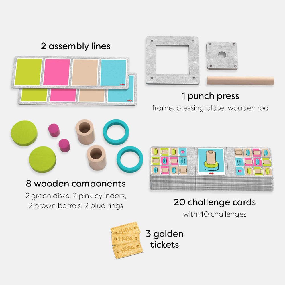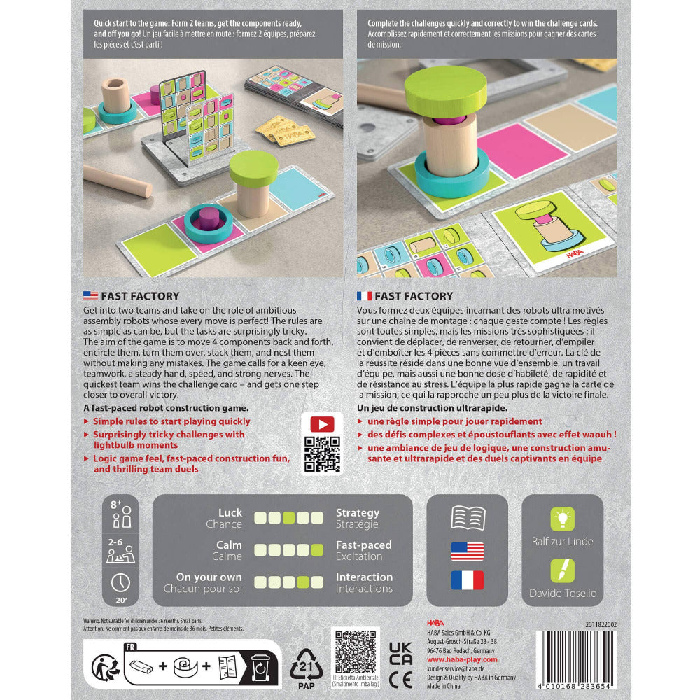 In this fun family game, players step into the role of ambitious assembly robots to challenge their teamwork and dexterity! Fast Factory - Team Challenge Game is a fast-paced assembly game that's simple to learn but filled with tricky tasks to master. The quickest team to complete the challenge card earns golden tickets, bringing them closer to becoming the ultimate assembly champions. Fast Factory is perfect for families, friends, and anyone who loves a thrilling logic challenge.
