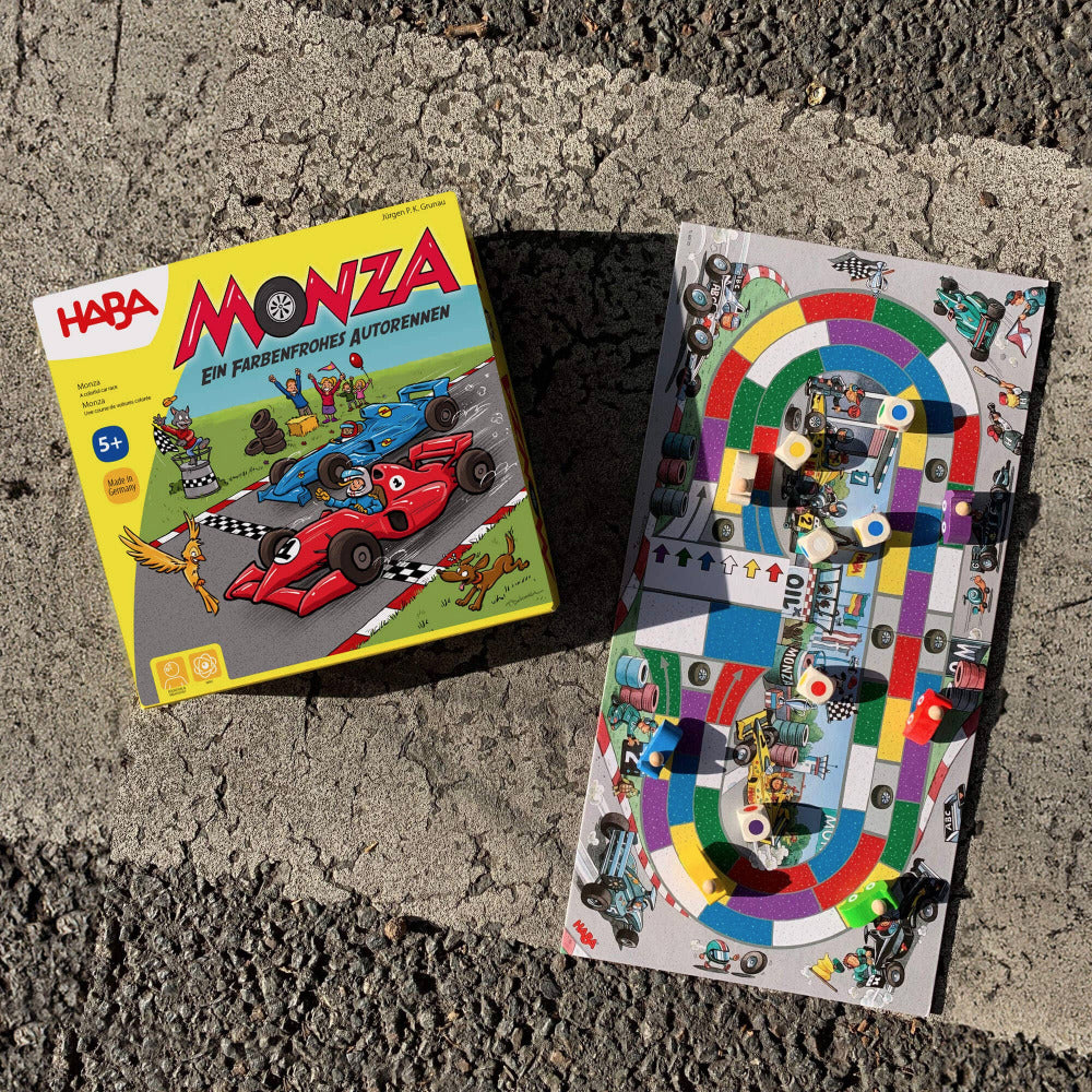 Only the player who plans ahead and uses every color wisely will cross the finish line first. Inspired by the Italian city famous for its Grand Prix, Monza brings the thrill of racing to your family game night. Get ready, set, roll—and race to the finish line with Monza! A car racing board game encouraging tactical thinking and recognizing shapes and colors.