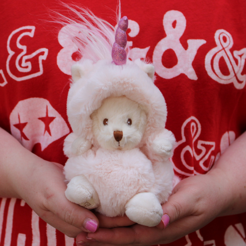 This pale pink Ziggy the Unicorn has a magnificent secret that is as cute as the unicorn horn that rests like a crown on their head. Featuring an adorable mane and tail of the same texture, Ziggy Unicorn is actually the cutest little bear in a unicorn uniform! You could have fooled us. This magical pal also features chocolatey brown, embroidered eyes and nose that simply add and contrast to the pastel cuteness of the rest of this furry friend. This unicorn is sure to help transport whoever holds it to an enchanting time of rest and relaxation or imagination and playtime.