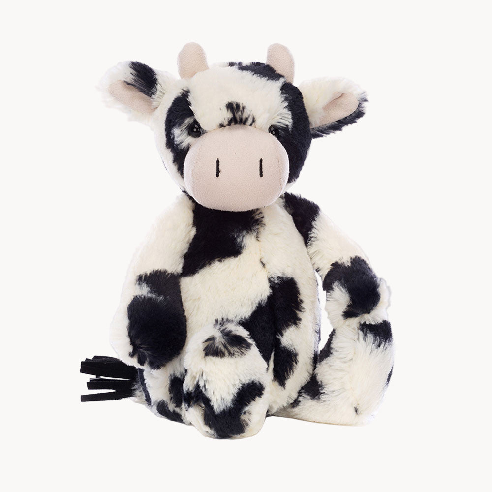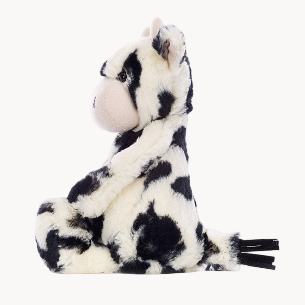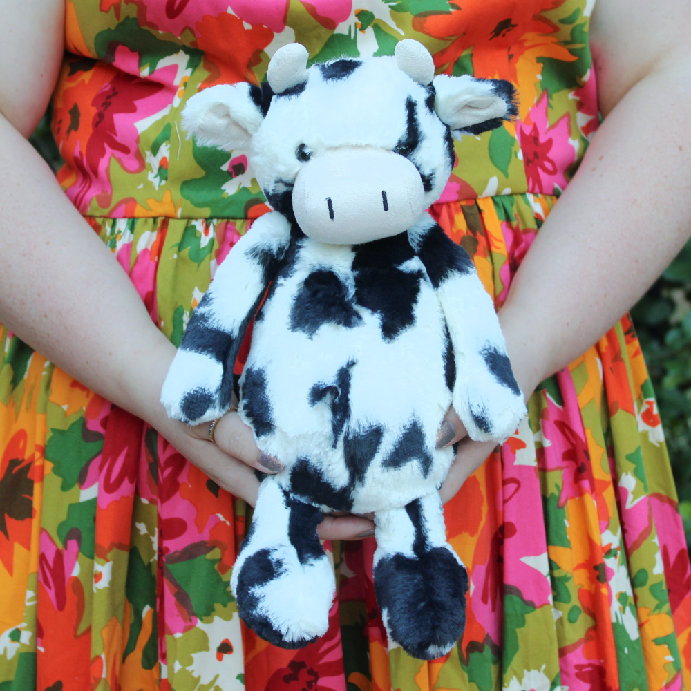 Scrumping apples? Not Bashful Calf. She’s a daisy-munching, kooky little cow, who enjoys listening to songs about farm life. With her soft white horns and lovely splotchy fur, she's so happy she jumped over the moon!