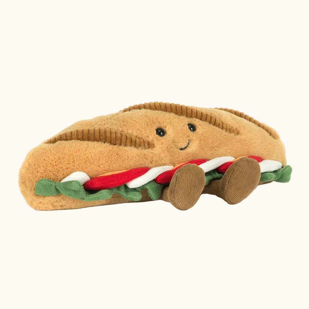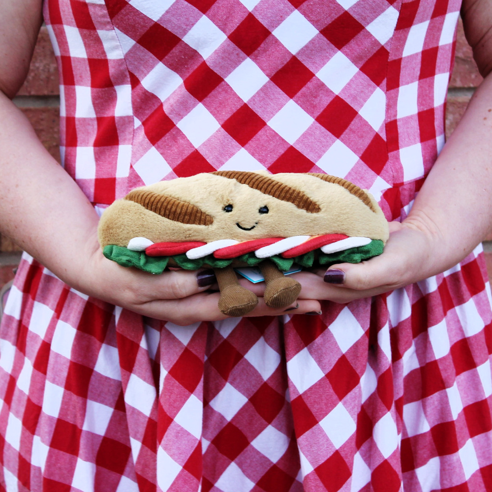 Some baguettes dream of Parisian cafés. The Jellycat Amuseables Caprese Baguette prefers a field at dawn, fitted with a tote bag and a keen eye. Car boot sales are her happy place – the thrill of the hunt, the joy of the bargain. Her most recent find? A vintage teapot for $1! She has an eye for a deal and a knack for gentle haggling – polite, but firm. By lunchtime, she’s home with her haul, ready to show Amuseables Brie and Camembert her latest finds over a pot of something brewed in that new-old teapot. Next weekend? It’s a done deal.