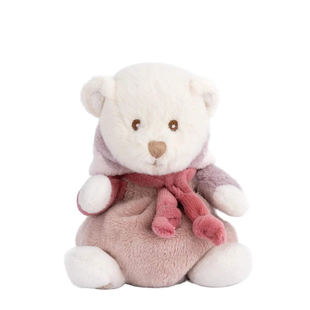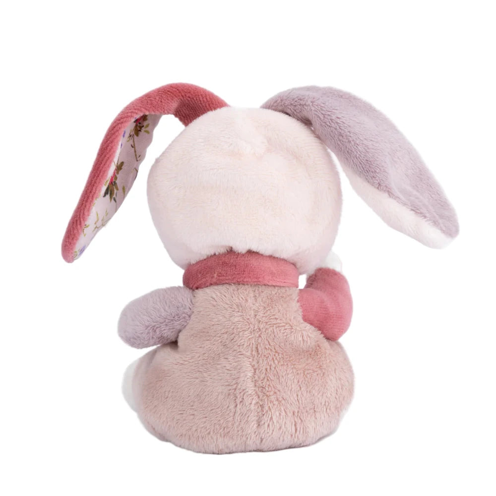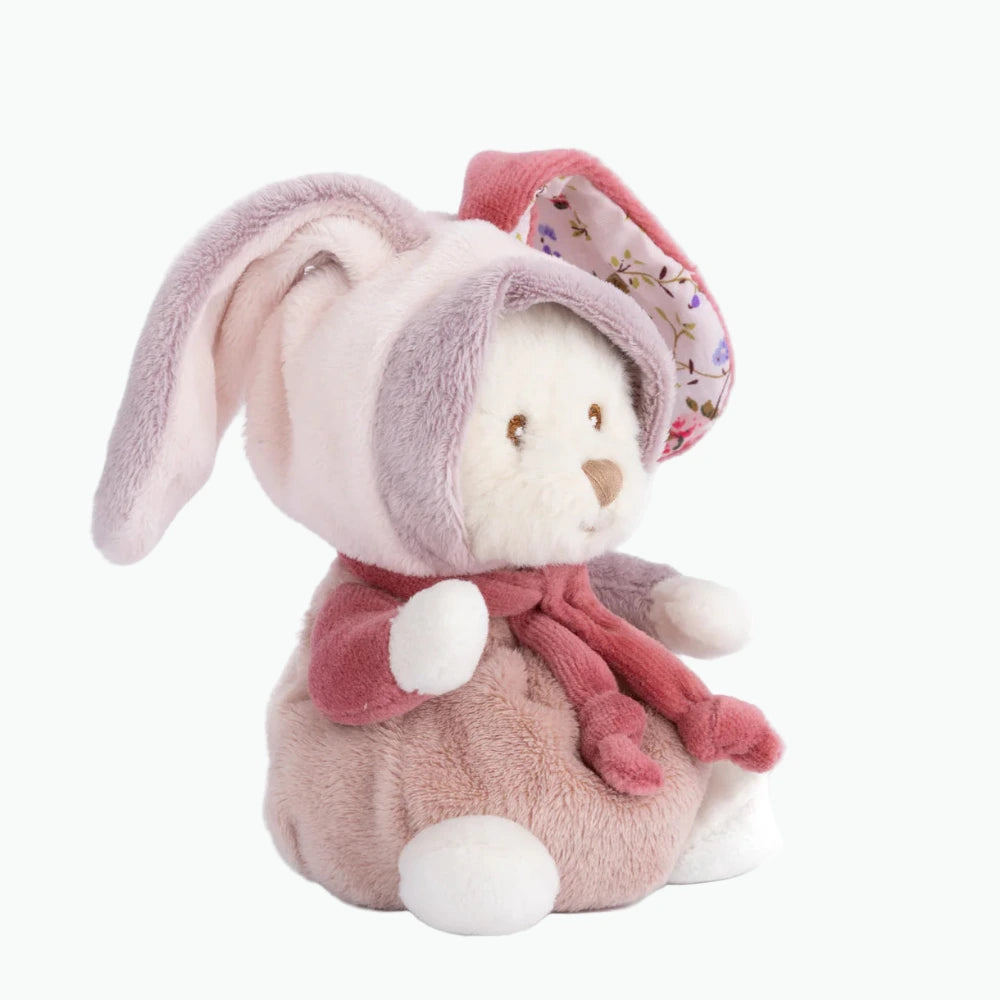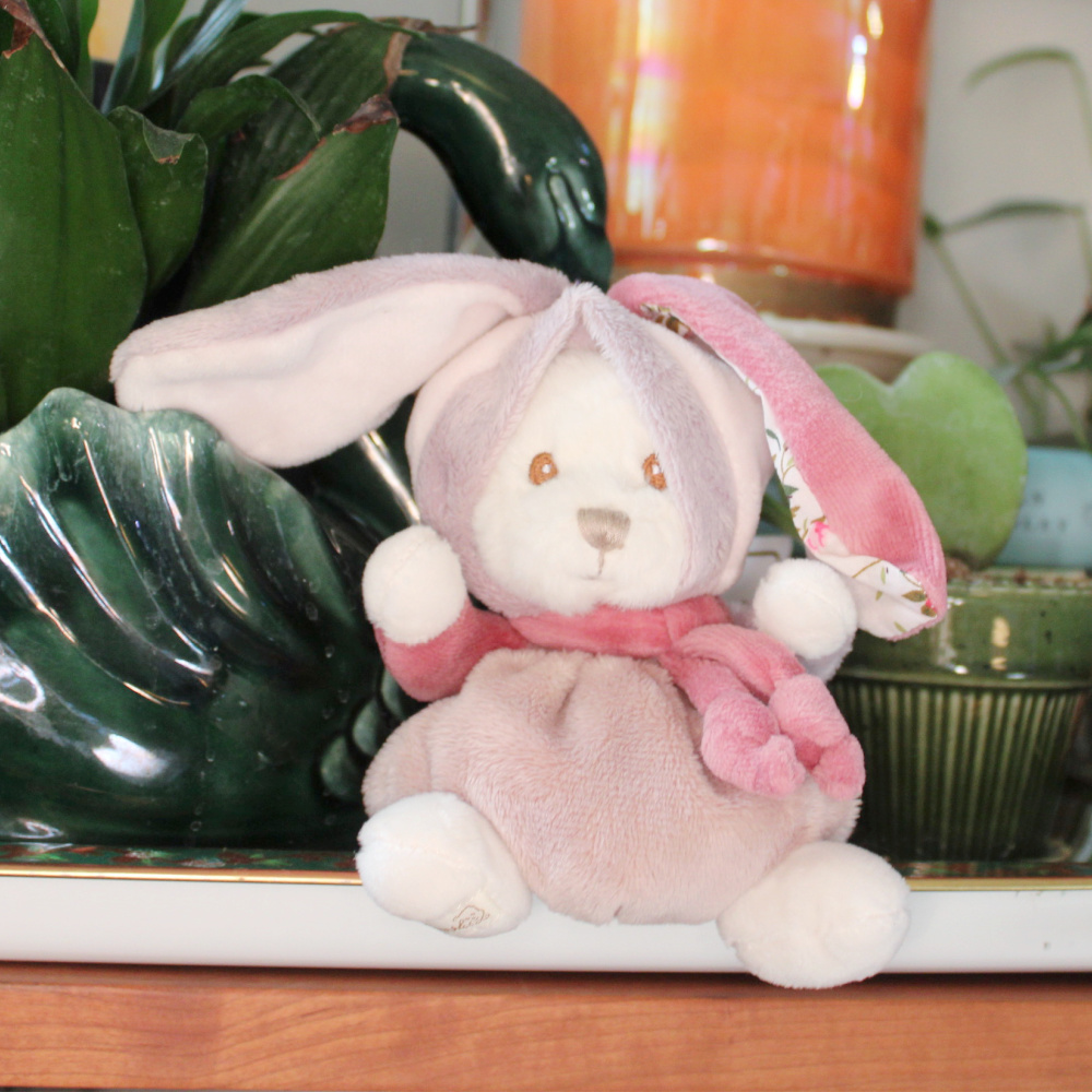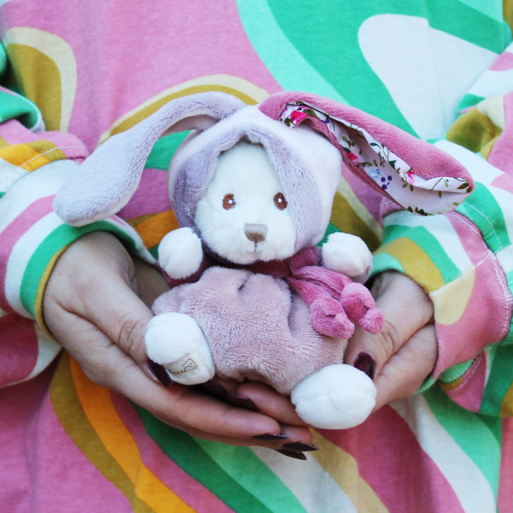 Introducing our new plush pal, Ziggy Bibi, the bunny! Bibi is dressed in a rose and pink color getup that has the cutest detailings. Guess what? Bibi is secretly a white bear with chocolate-colored embroidered eyes and tan nose. Bibi is styled in a bunny costume complete with an adjustable bunny-eared hoodie. One ear is lavender on top and the other is a rosey-pink that has a floral pattern on the reverse. There is also a cute rosey colored scarf with puff balls attached. The color of the sleeves of the hoodie correlates to the ears of this stylish ensemble. So sweet!