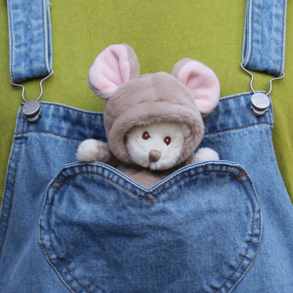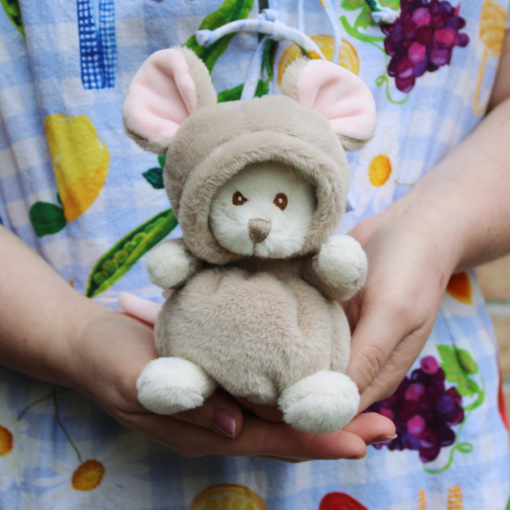 Introducing our new plush friend, Ziggy the Mouse! This light brown mouse has the sweetest demeanor with his large, round ears sitting on his head and a white, rope-like tail behind him. This sandy brown mouse has pops of white in the face, hands, feet and inside the ears. The facial features also have chocolate brown embroidery on the eyes, nose and mouth. This adorable friend is sure to be a quiet companion that is sure to make fussy little ones feel less alone and perhaps all the more entertained, as this mouse is actually a polar bear in a mouse costume with the ears being attached to a movable hood!