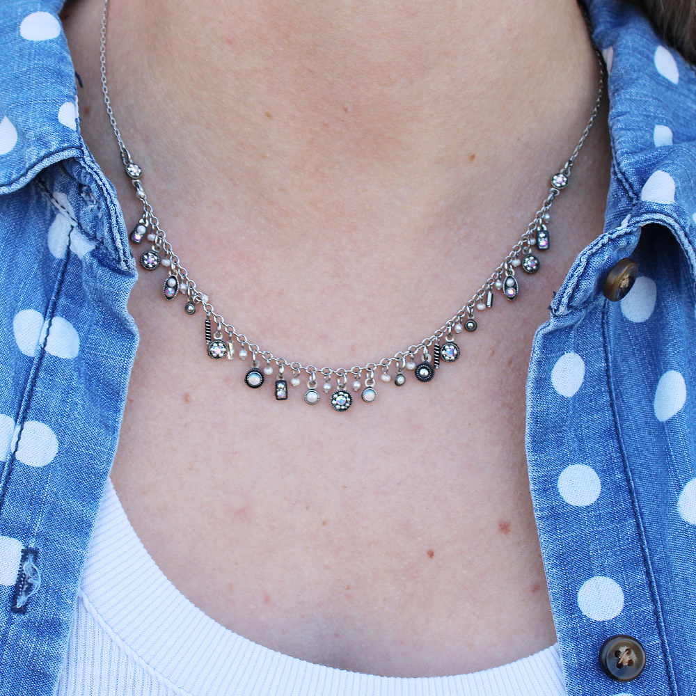 This Delicate Filipa Crystal Pearl Necklace is a brilliant combination of sparkle and shine. Featuring European crystals and crystal pearls, Japanese and Czech glass beads, this dainty necklace is packed full of baubles that are so to help you let in the lovely. This necklace would pair great with a variety of looks and can be worn solo or with other necklaces for a layered look. The beautiful baubles are a mix-match of size and shape, with a small round flower bead at the end of both sides of the pearl baubles. The whole design is a stunning creation that is sure to be a treat to wear.