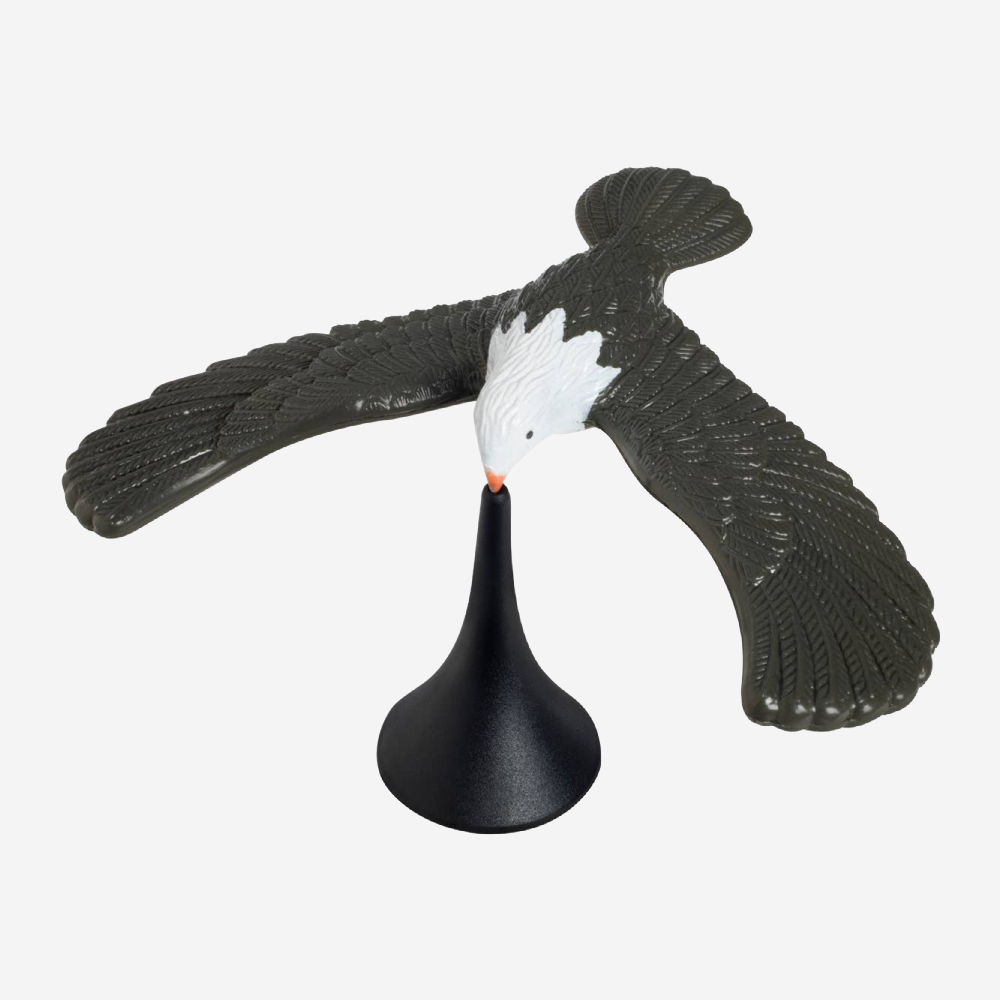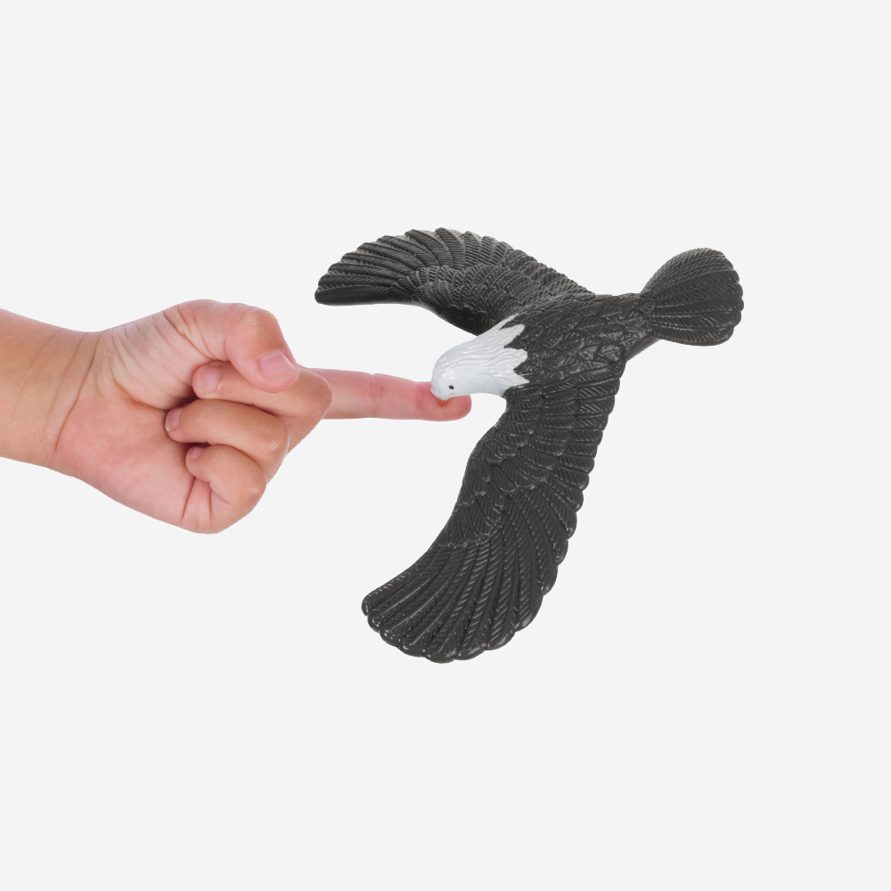- Eagle balances on its beak atop a 2.75-inch plastic stand or on the end of your finger