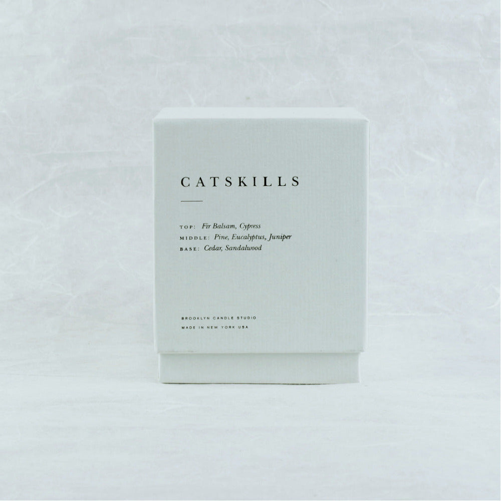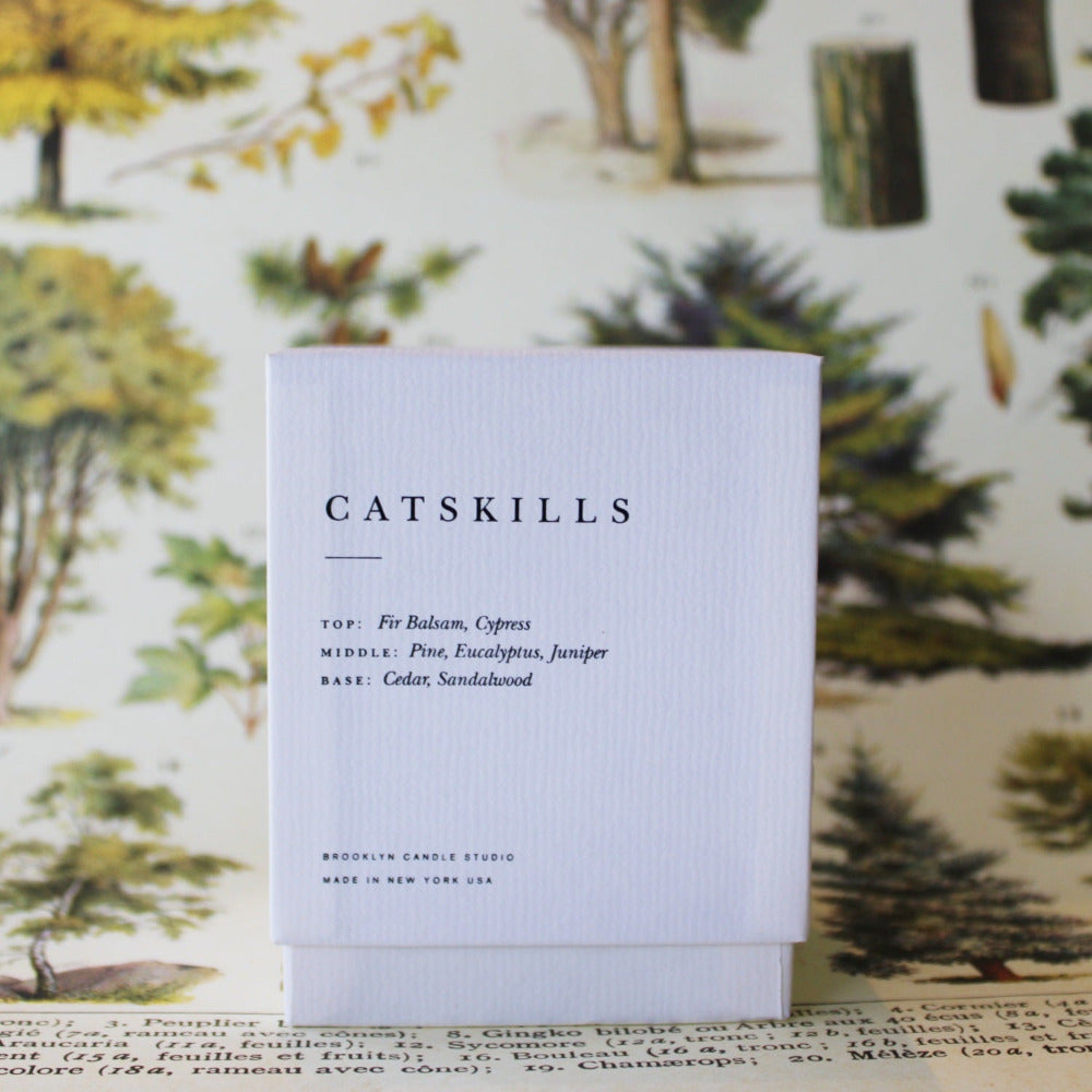 When you light the Catskills Classic 2-Wick Candle, you'll imagine a tranquil hike in the woods of the Catskill Mountains after an autumn rainstorm, as your feet crunch atop fallen pine needles and the fresh air is flecked with the scent of cedar, cypress, and juniper. The Catskills Escapist Candle offers an olfactory 'visit' to the lovely Catskills Mountains. The candle is double-wicked and housed in white textured boxes and screen-printed glass tumblers.