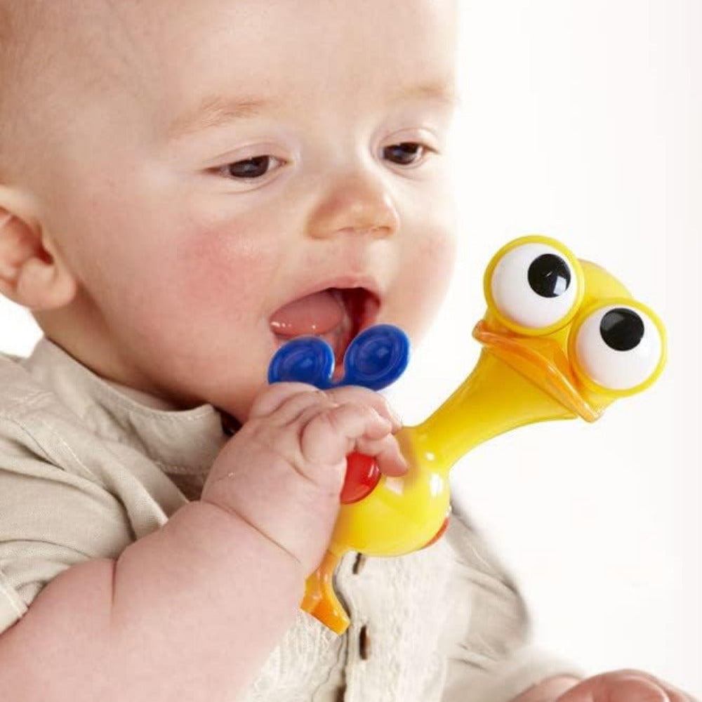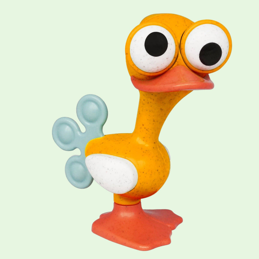 We have to introduce you to our new friend, this cute and whimsical Crazy Eyed Bird. This is for the little one in your life and we are certain that this bird will grab their attention and become their new bff. It is ideal for the encouragement of imaginative play, but we are sure that once they learn how to move his head and feet, squeak his body, make him rattle and adjust his eyes into lots of funny positions, they won’t be able to get enough. This toy may naturally gravitate towards your baby's mouth but not to worry, he was designed with teething in mind.