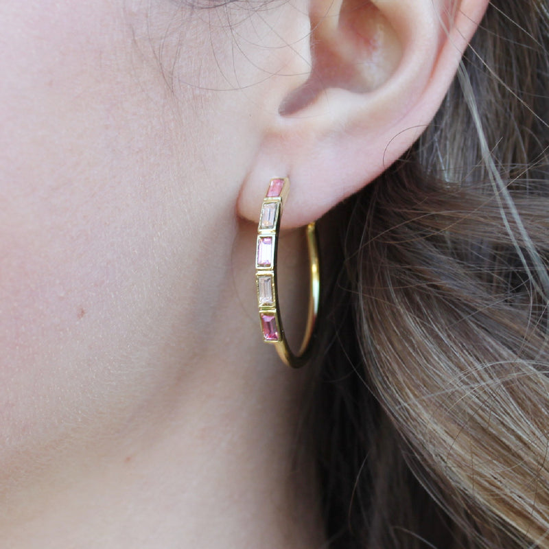 Take a moment and enjoy the subtle beauty of these hoop earrings.  The Pinks Diana Gold Hoop Earrings, with their square cut European crystals in shades of pink, are just what you need for every season!  These earrings can be worn all year round with their fresh take on a classic design. You are certain to find yourself reaching for this pair of earrings more and more. As you play around with your style, you may find yourself craving the contemporary classics. How can you not when the earrings look like this?