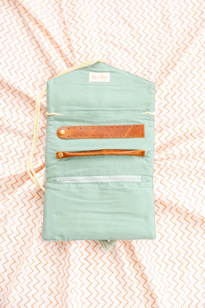 • Zippered pouch, spacious pocket, ring roll and earring panel.