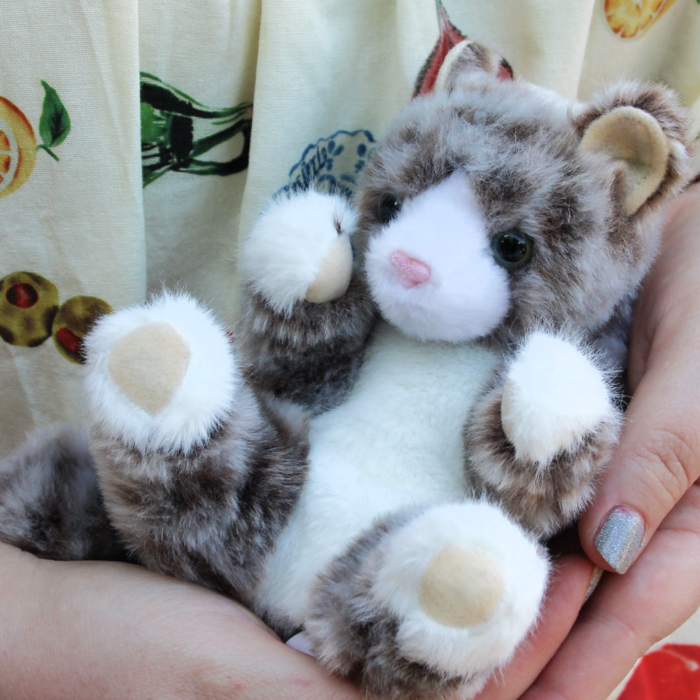 This adorable Gray Stripe Kitten Lil' Baby is an adorable baby who’ll stay little forever!  This soft little companion is posed to lie on her back with raised paws in the air waiting for hugs and pats.  This tiny tabby cat features soft striped plush fur along with beans in her bottom for a lifelike weight. Her bright white paws are accompanied by a pale facial marking and light colored belly. Shiny, dark eyes and a small, pink nose come together to lend her a lovable expression. Take home this pick of the litter today!