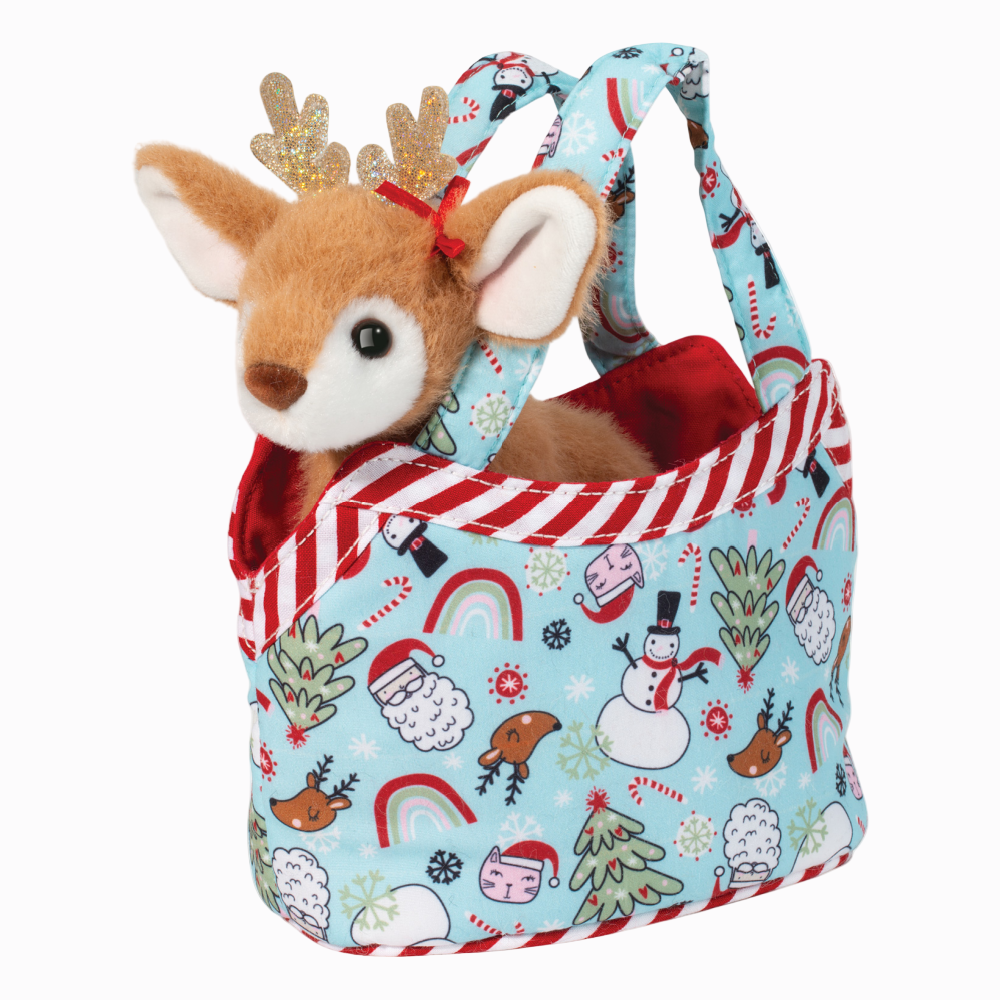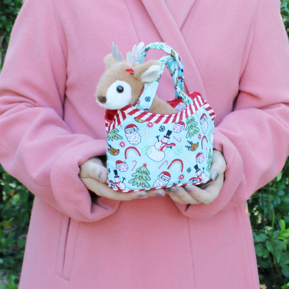 This holiday season just got a whole lot more merry and bright with this reindeer friend in attendance. This reindeer plush comes in a sassy sak tote that is sure to make travel and cleanup a whole lot simpler and chic. This cutie sits in a sak that is decorated with holiday goodies like candy canes, trees and even Santa himself. All of these prints are sprinkled on a light aqua back drop with a red and white peppermint border on top and bottom, lining the design. The reindeer also features sparkles on their antlers and a single, thin, red bow on one ear. Cute!