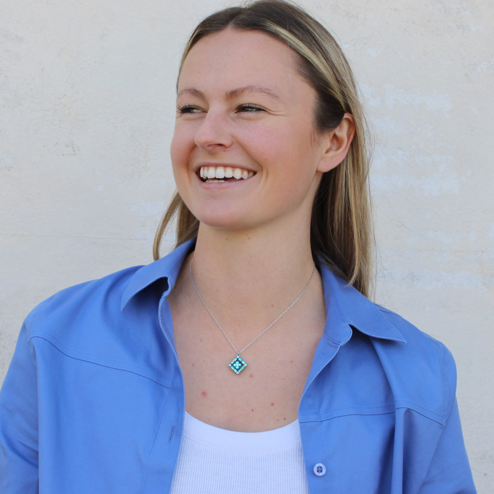 We are certain that you will love this diamond-shaped La Dolce Vita Mila Necklace. It is sure to make a great gift for yourself or a loved one. We adore the beautiful color combinations and mesmerizing design. The lovely tones of deep and cool ocean colors paired together create a visual delight. It is perfect for everyday wear and is sure to be the talk of all your friends. You could style this necklace in a variety of ways. Wear it solo and let the design speak for itself or you could pair it with other necklaces to create a fun layered look that is uniquely you.