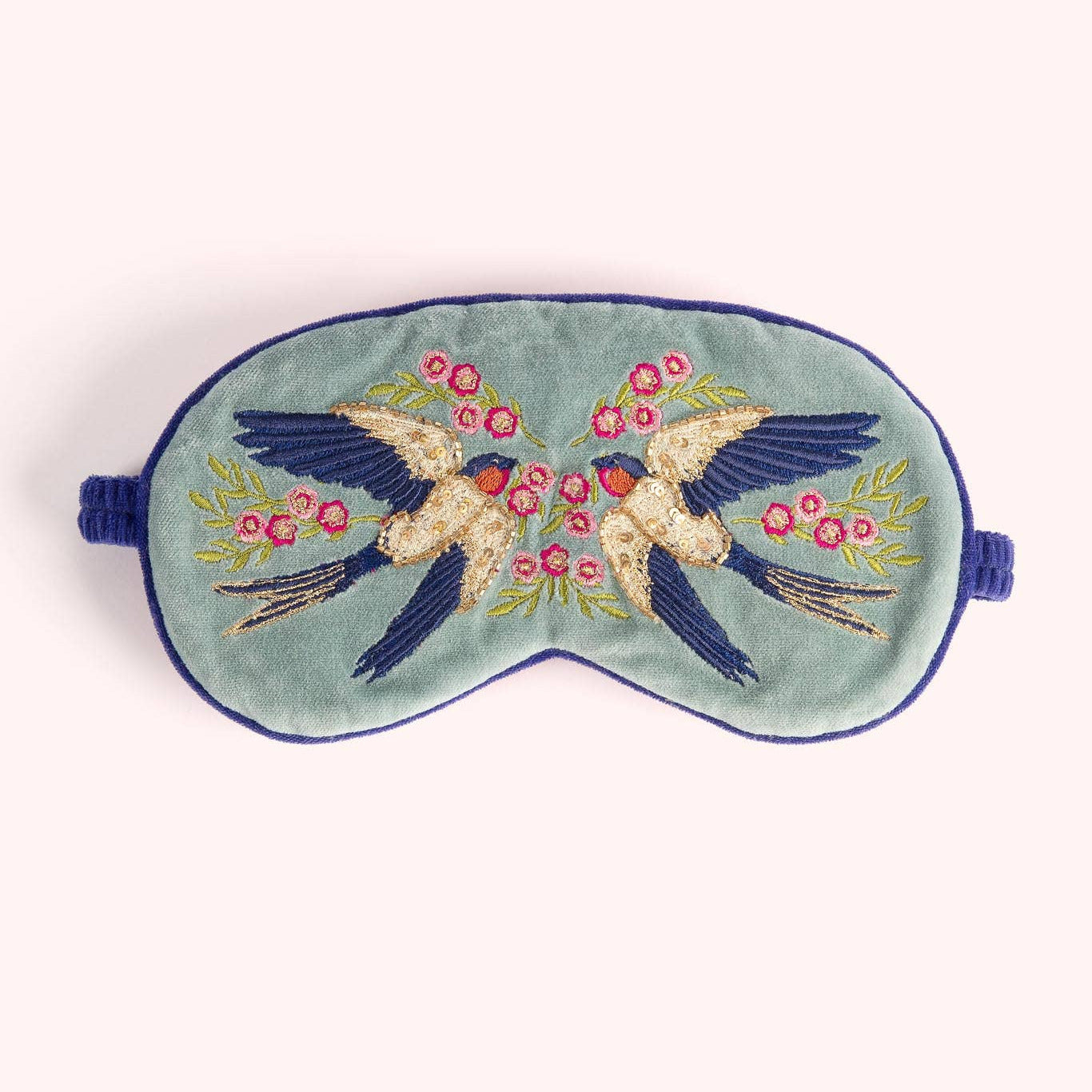 This sweet eye mask is perfect for those nights when you just can't get to sleep. The material is sure to help you unwind and relax. The adorable design of the Luxury Swooping Swallows Eye Mask features a pair of embroidered swallows that is surrounded by embroidered foliage with charming little flowers. The lovely lavender aroma is a perfect match to bring this design to life in a sweet and stylish way. The mask itself is a soft blue with darker blue, pinks, ivory and gold. Why not be stylish while you sleep?