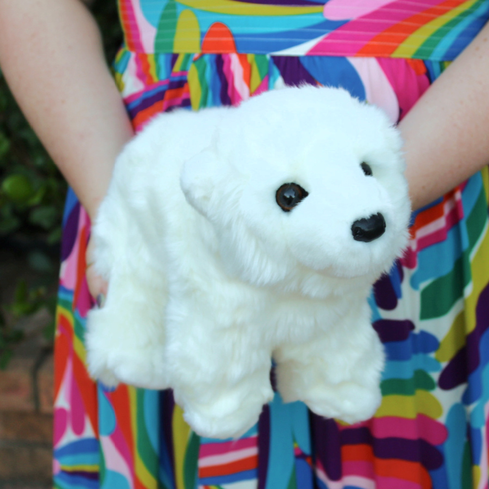 Meet Marshmallow, the Polar Bear! Marshmallow is a white polar bear that is just waiting to be snuggled! Her round, soft body and floppy paws makes for an ideal cuddle companion. She also features the small rounded ears of her species and a soft, leatherette nose that is a detail that makes her feel all the more lifelike. She has the sweetest dark brown eyes that are sure to bring out her charming nature. This polar bear is sure to make a welcomed addition to a happy home for the kiddos and collectors as well! Marshmallow is sure to keep you cozy with her bear hugs.