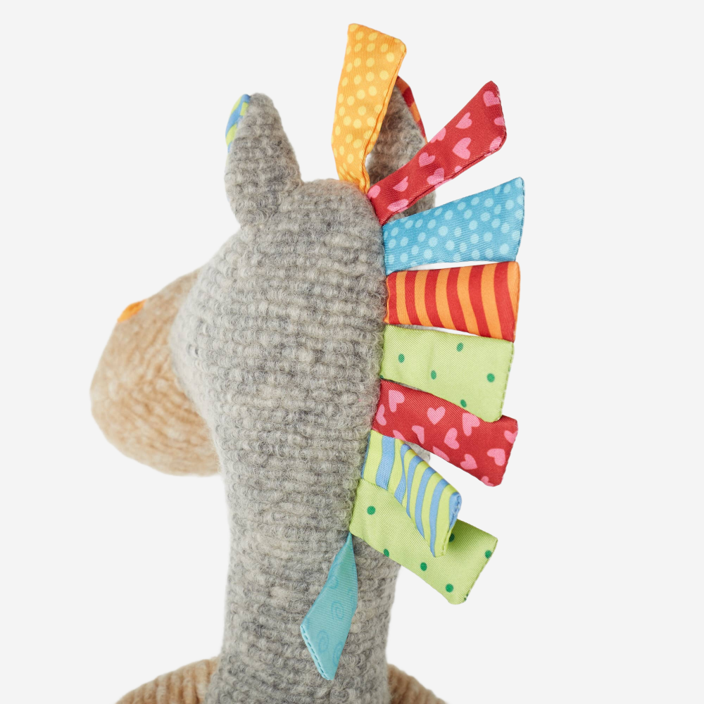 We are beyond thrilled to introduce you to this happy Patchwork Horse. This pony pal is made by traditional German craftsmanship. This grey horse is stuffed and has an old-school knit body, but also has pops of vibrant colors in his mane, tail and hooves. There are portions of tan in his snout and all four legs with a pop of yellow for nostrils! The pops of colors are cotton patches in different patterns and colors like pink, blue, yellow and green with stripes, hearts and more patterned designs. We are certain that this cutie is sure to trot his way into a happy home.