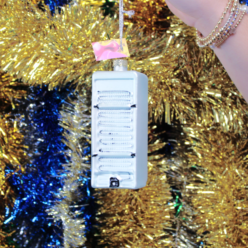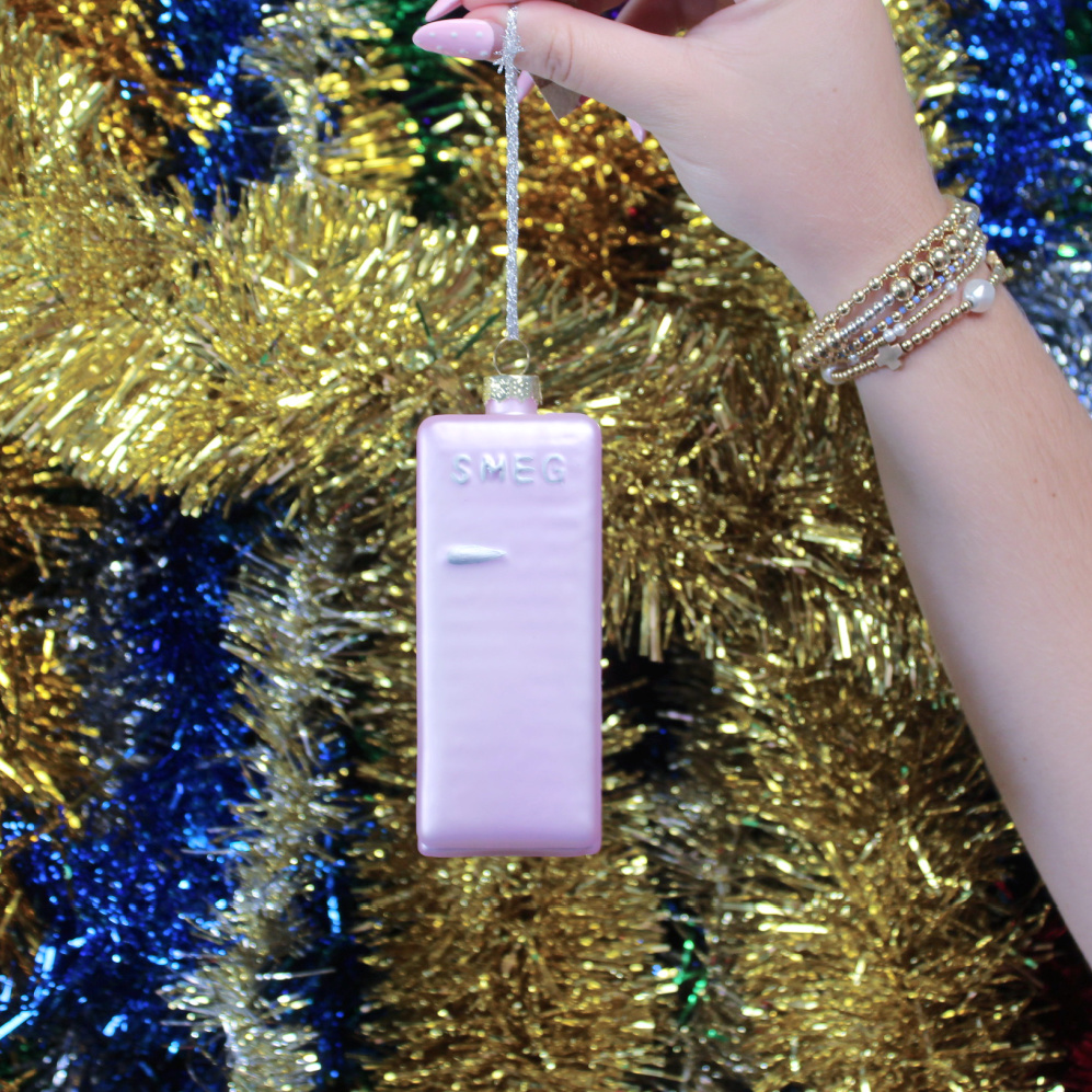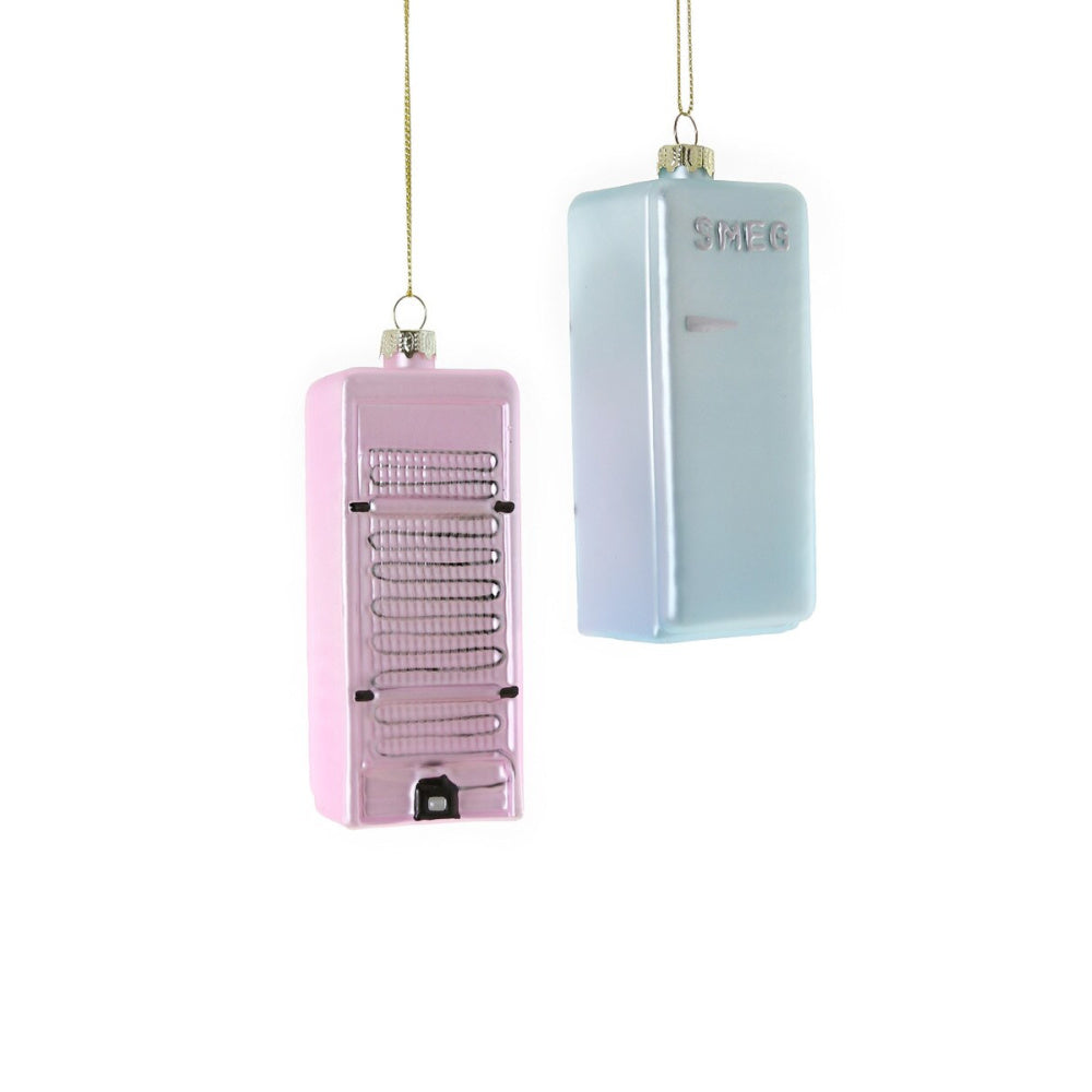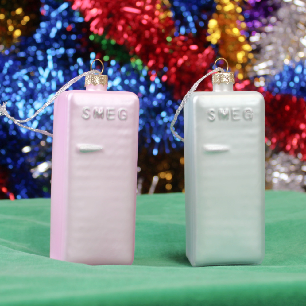 This vintage inspired refrigerator ornament is a cute blast from the past that is sure to bring a touch of nostalgia to your tree or anywhere you choose to display it! Coming in two crazy cute colors aqua and pink, this fridge is sure to bring a flair of fashionable whimsy to your space. It would also make a quirky gift for a friend or loved one! This refrigerator has the word “SMEG” in silver lettering on the door with a matching horizontal handle. The back of the ornament also features even more realistic details making it all the more unique.