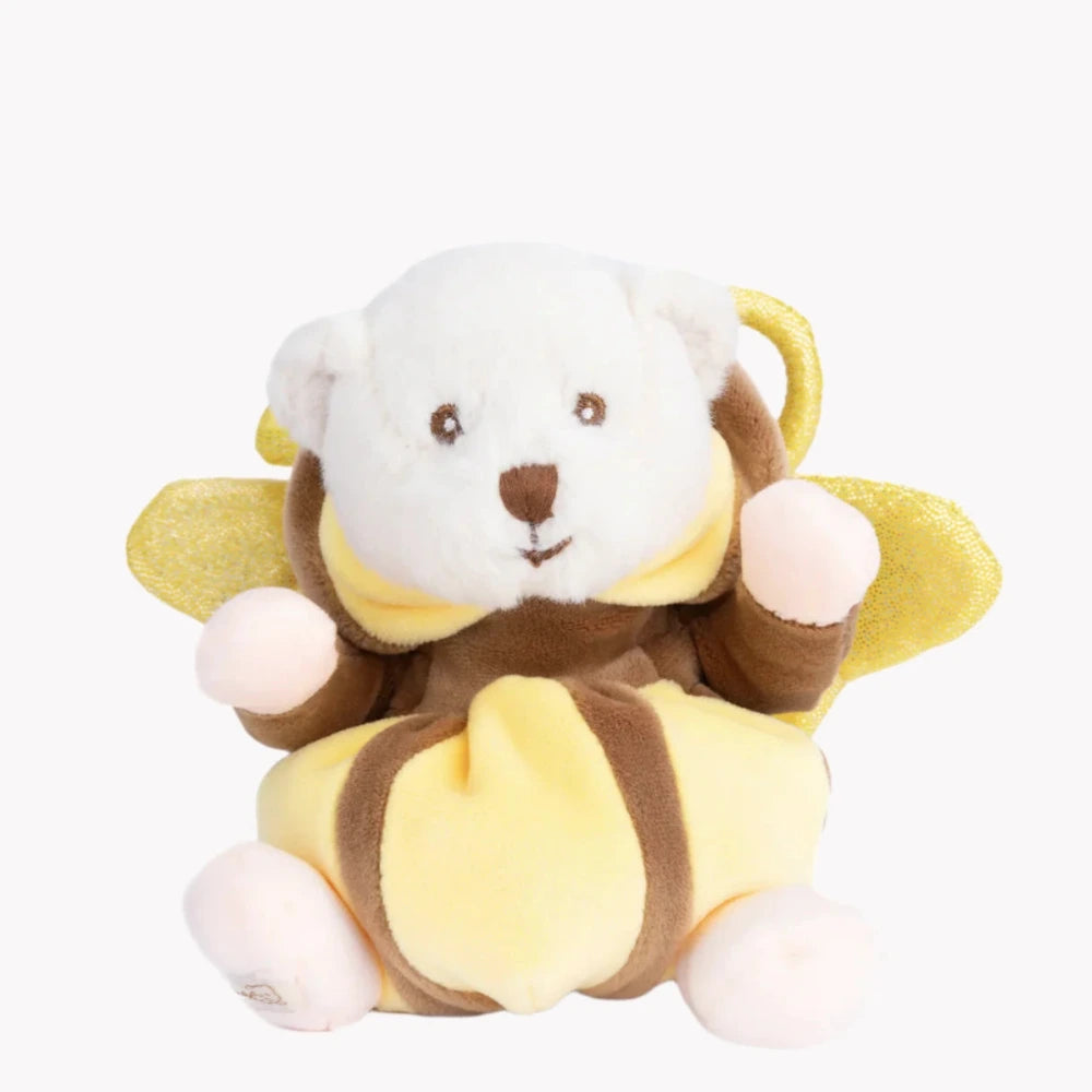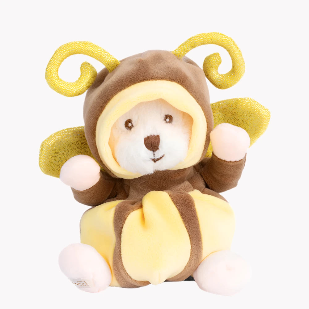 This adorable white bear is wearing the cutest costume of a yellow butterfly. The hoodie portion is a warm chocolate brown that also has two curly yellow antennas on the hood. The Ziggy the Lemon Butterfly also has golden yellow wings. This color combo is heavily featured throughout this design and gives a welcoming feel to this cute creature. Our new pal has a smile that could light up a room with the chocolate brown embroidered eyes, nose and mouth. This cozy companion is sure to make those fussy days a little more lighthearted; allowing you to escape those cares as the imagination takes flight.