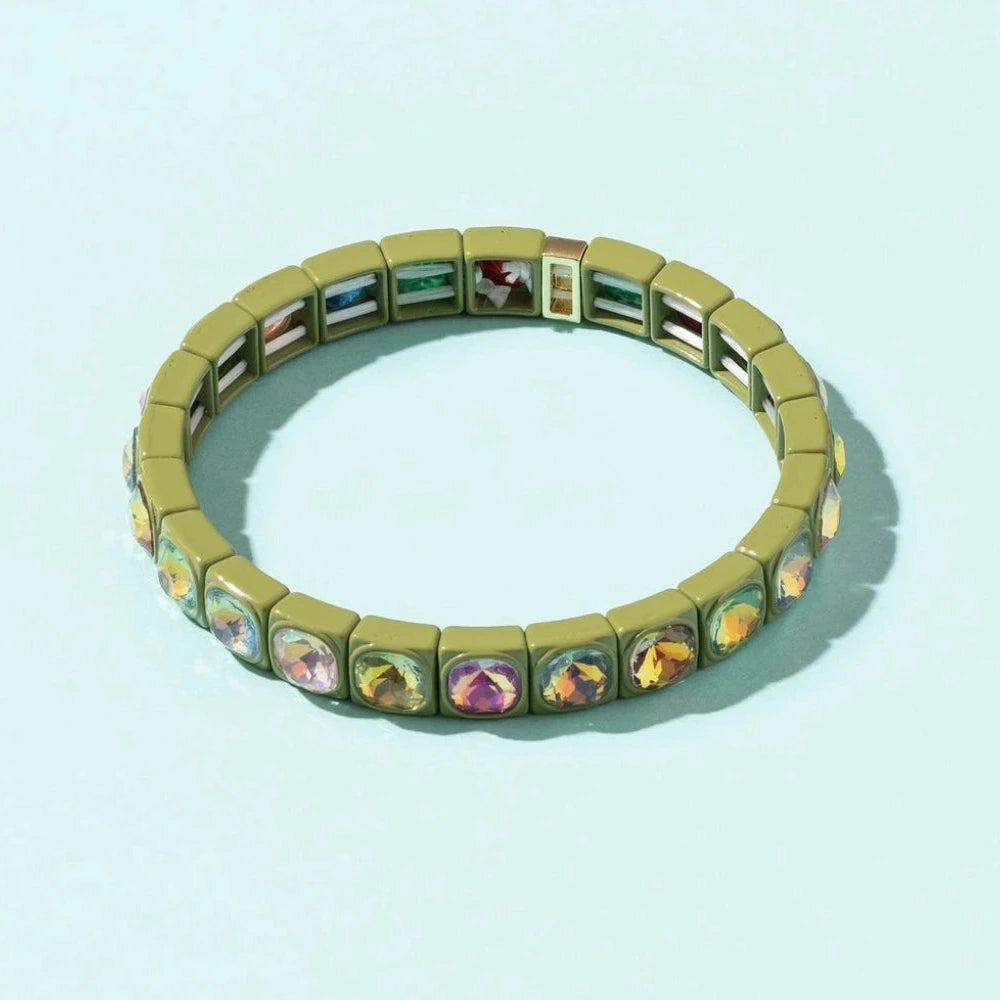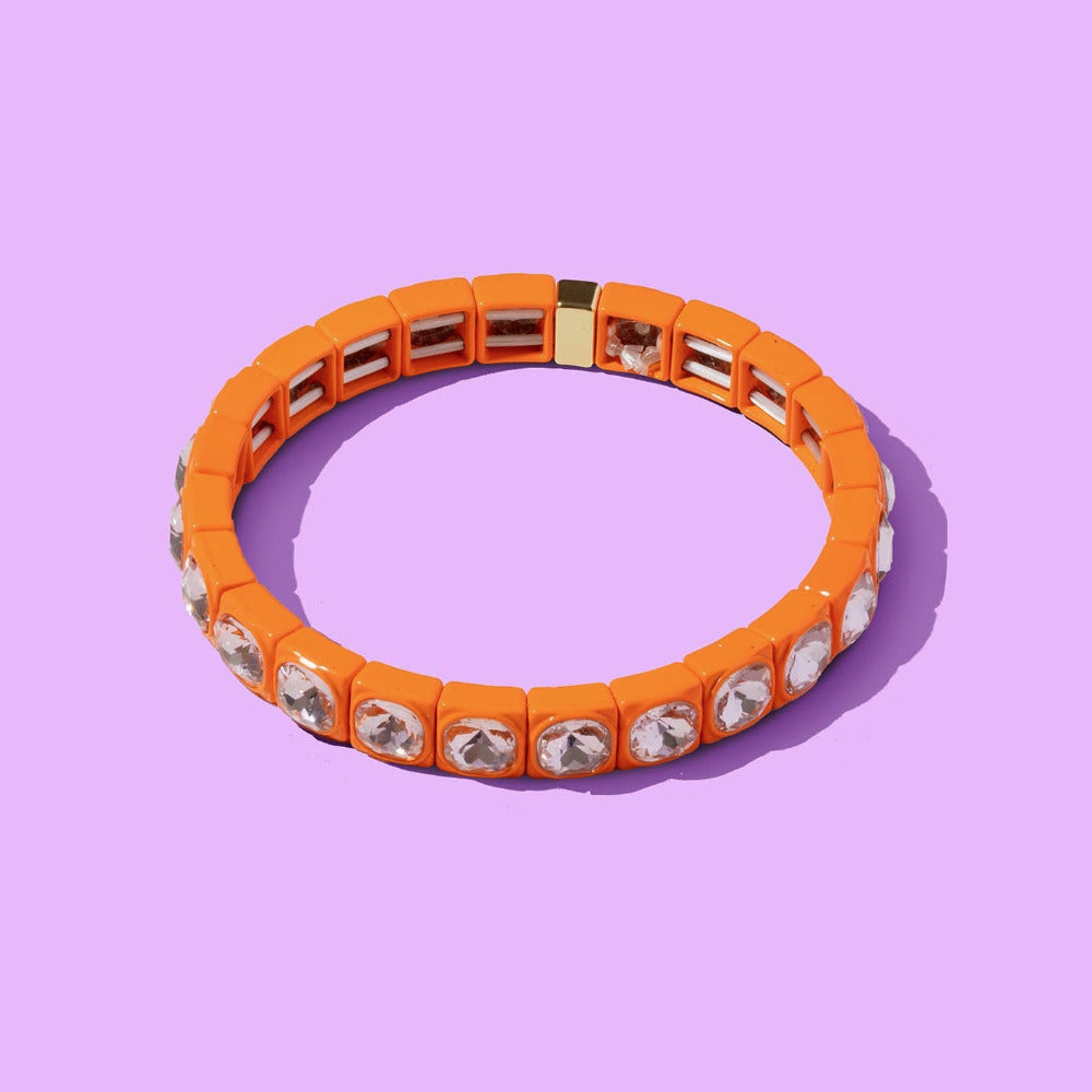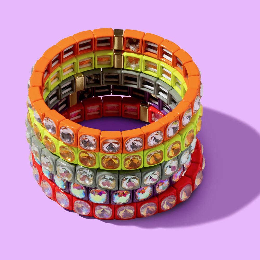 This brightly-colored painted enamel bracelet features square stones that are sure to catch the light in a beautiful way and  has a fun 00’s feel that is sure to bring a smile to the face of those around. This design is great for stacking with other variations of this Zoe Enamel Stretch Bracelet or with other accessories. The stretch styling makes for easy and comfortable wearing. Buy one for yourself and your friends or mix and match with them if they have their own. This bracelet is sure to make a fun addition to a variety of collections and is sure to be a blast to wear and style!